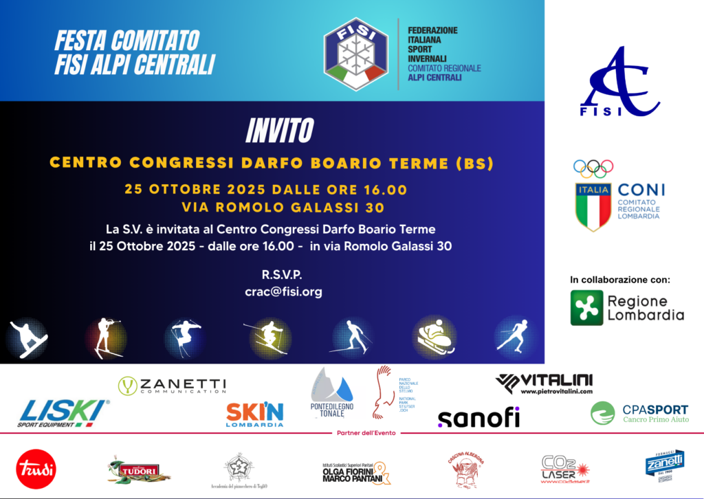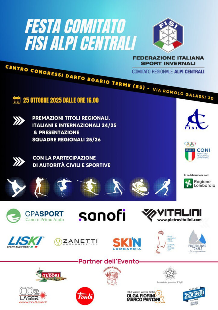 Milano, 2 ottobre 2025 IL Comitato Fisi Alpi Centrali è lieto di invitarvi alla Festa classica di inizio stagione che si terrà il sabato 25 ottobre, al Centro Congressi di Dario Boario Terme a partire dalle ore 16.Con la partecipazione di Autorità civili, sportive e federali, sarà l’occasione di premiare i titoli regionali, italiani ed internazionali degli Atleti Alpi Centrali