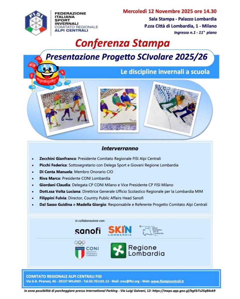 Il Comitato Regionale organizza in collaborazione con Regione Lombardia – Sanofi – Ufficio Scolastico Regionale Lombardia e Ski’n Lombardia, Mercoledì 12 Novembre alle ore 14.30 presso la Sala Gonfalone del Palazzo Pirelli in Via Fabio Filzi 22 a Milano la Conferenza Stampa di presentazione del Progetto SCIvolare 2025/2026