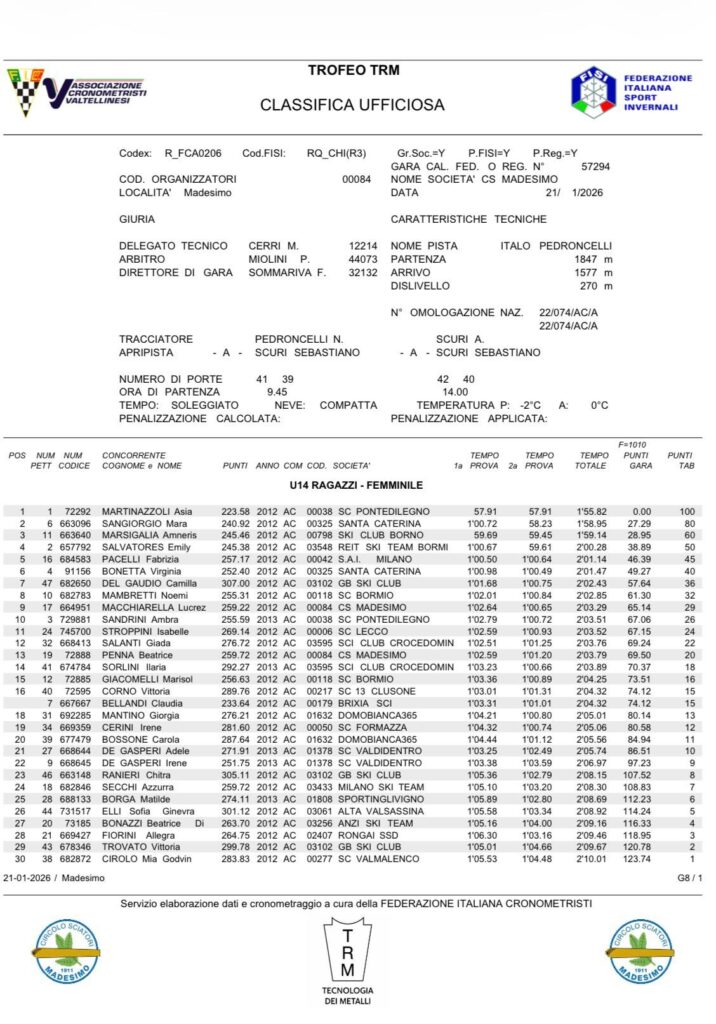 Nella categoria Ragazze U14, vince Asia Martinazzoli (SC Pontedilegno), capace di chiudere con un tempo totale di 1’55.82. Sul podio anche Mara Sangiorgio, in 2° posizione (Santa Caterina) e Amneris Marsigaglia chiude il podio con un buon 3° piazzamento (Ski Club Borno), entrambe autrici di prove solide e regolari.