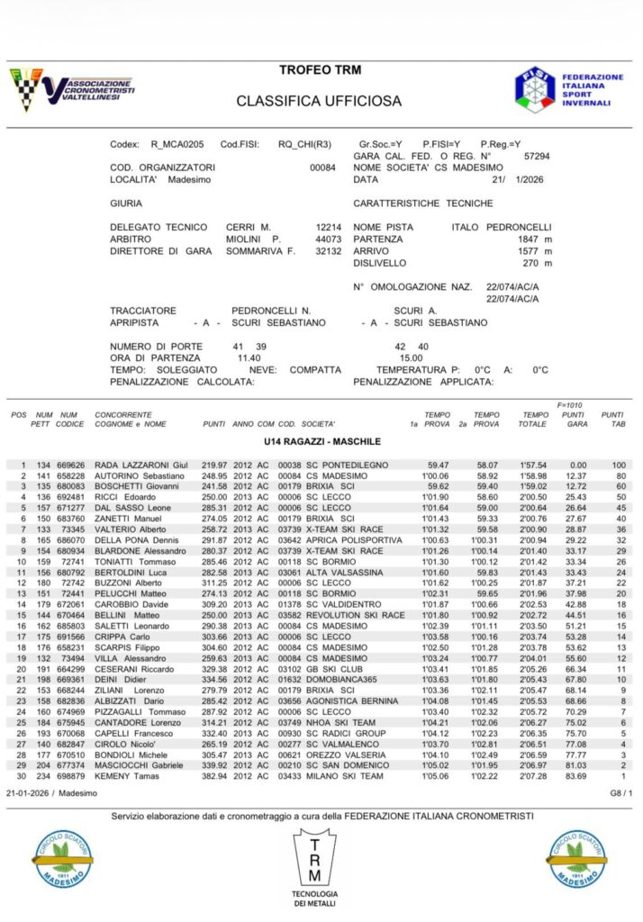 Tra i Ragazzi U14, gara combattutissima fino all’ultimo centesimo: a spuntarla è stato Giulio Rada Lazzaroni (SC Pontedilegno) con 1’57.54, seguito da Sebastiano Autorino al 2° posto in 1’58.98 (CS Madesimo), e da Giovanni Boschetti (Brixia Sci), staccato di pochissimo che chiude 3°.