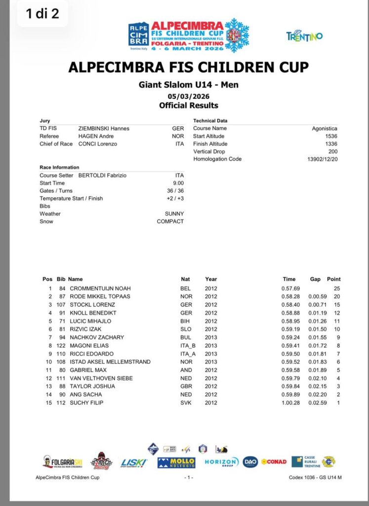 La prima giornata della Fase Internazionale dell’Alpe Cimbra FIS Children Cup regala subito un ottimo risultato: nel Gigante U14, disputato sulle nevi di Folgaria, Edoardo Ricci chiude 9º, confermandosi tra i giovani più solidi e continui del panorama internazionale. Su un tracciato tecnico e molto selettivo, con un livello altissimo di partecipazione, Ricci riesce a interpretare al meglio la gara,