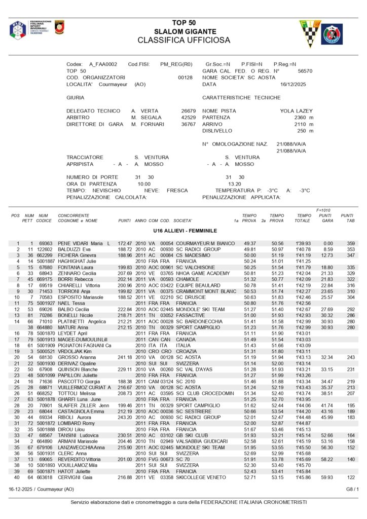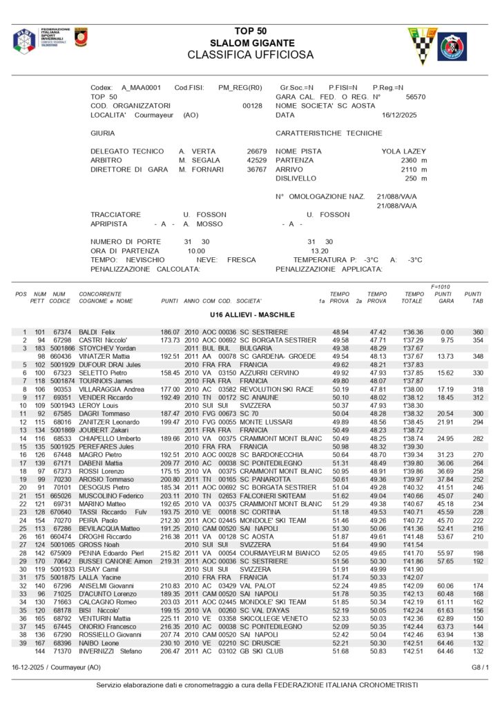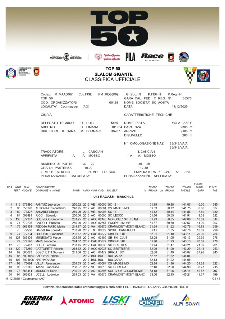 La stagione nazionale delle categorie Children si è aperta ufficialmente con il Trofeo Top 50 per Allievi e Ragazzi organizzato dallo Sci Club Aosta sulle nevi di Pila e Courmayeur. Nella prima giornata di gare gli Allievi erano impegnati in Gigante sulla pista Yola Lazey di Courmayeur. Doppietta del Comitato Alpi Occidentali in campo maschile: Felix Baldi dello Sci Club