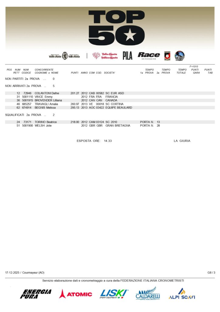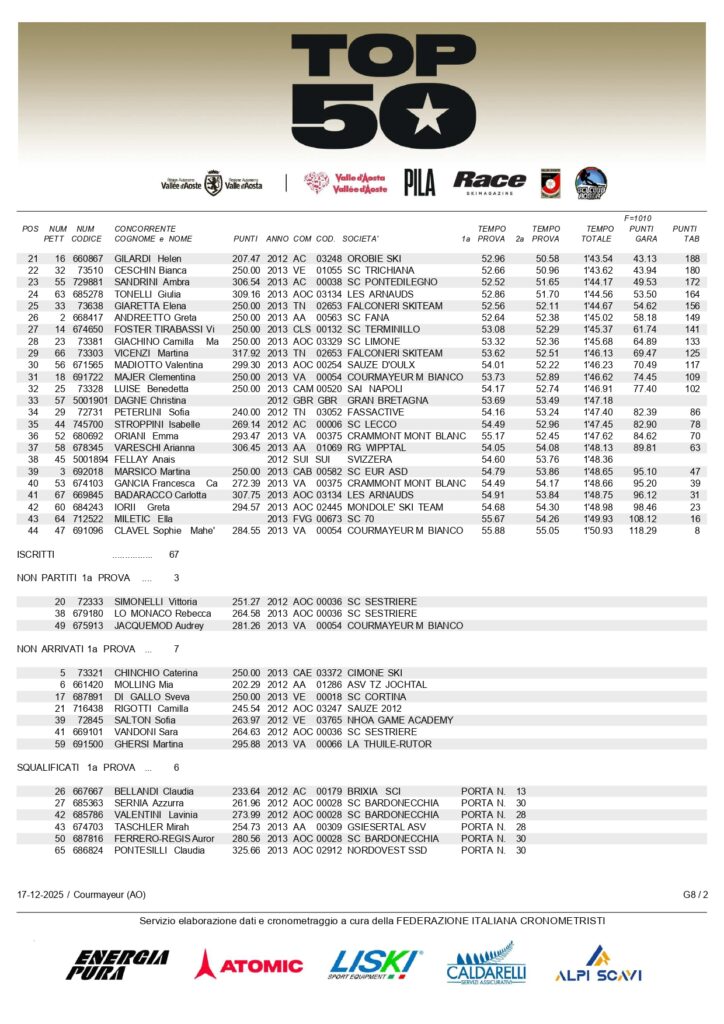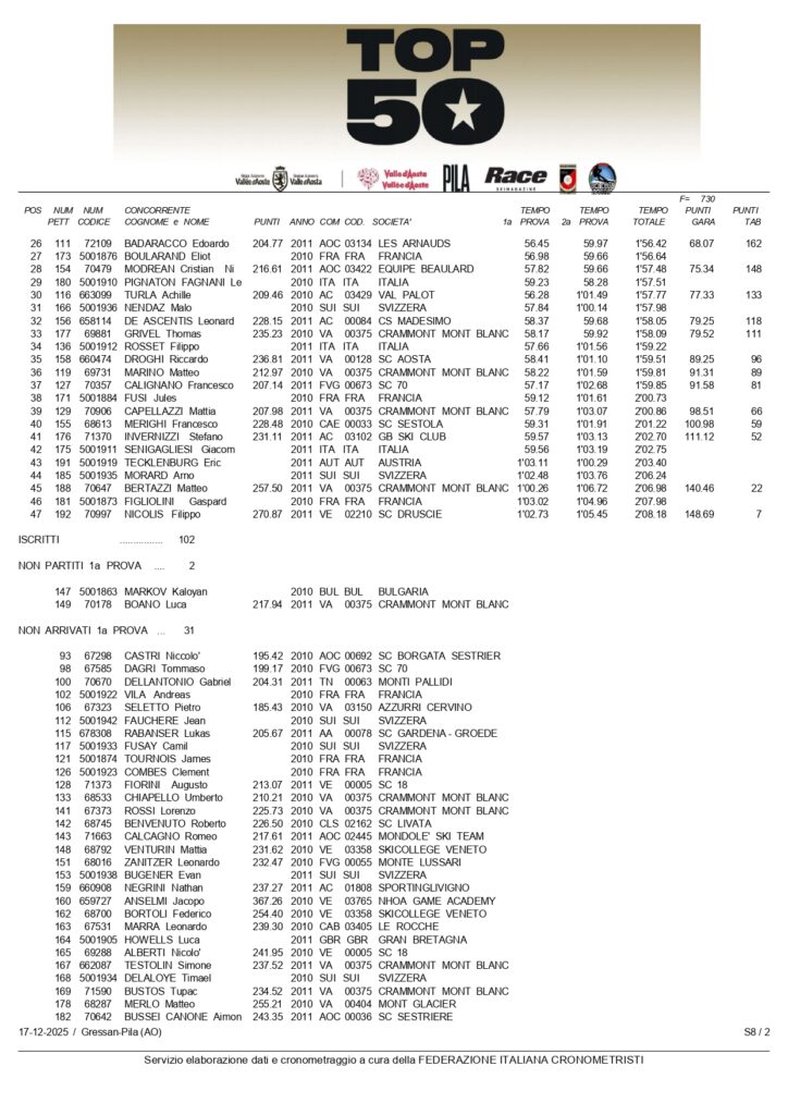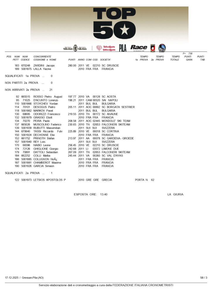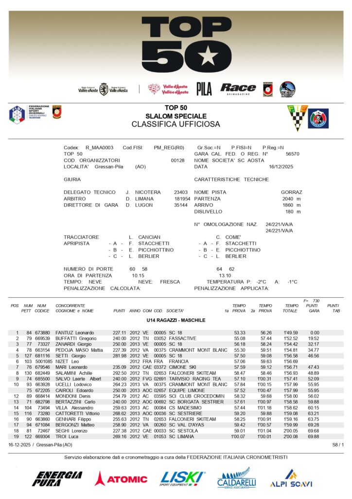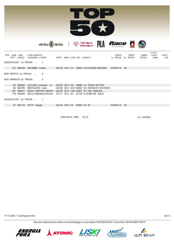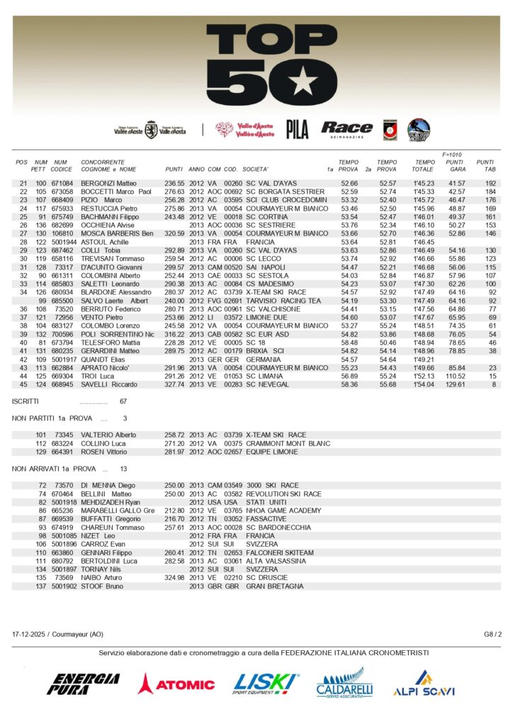 Nelle immagini: le classifiche e alcune foto dell’agenzia Acmediapress relative ad alcuni atleti del Comitato FISI Alpi Occidentali impegnati nel Top 50 a Pila e a Courmayeur