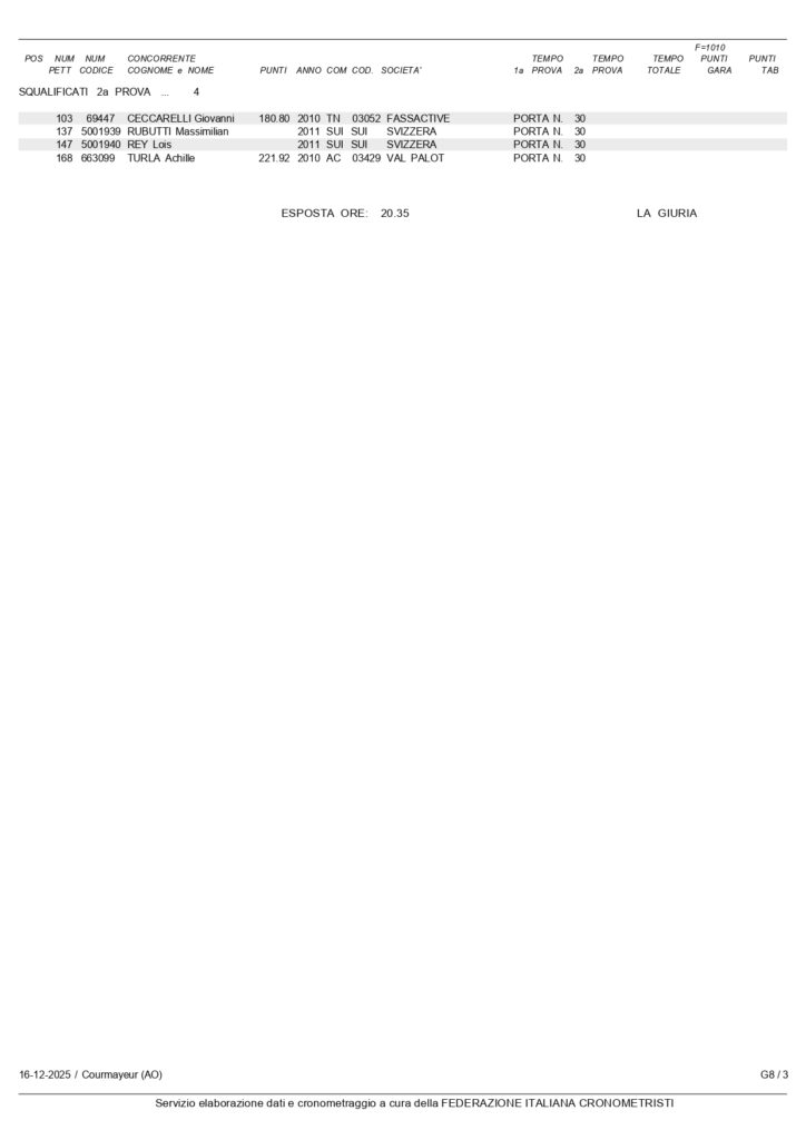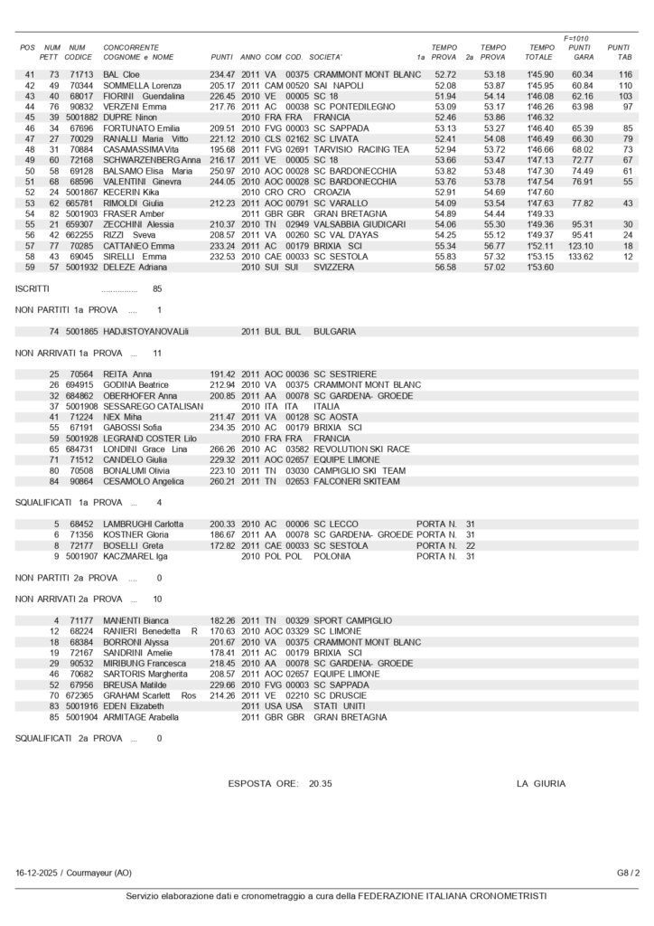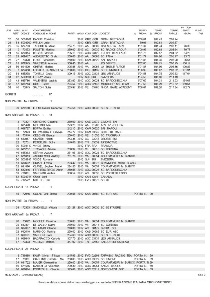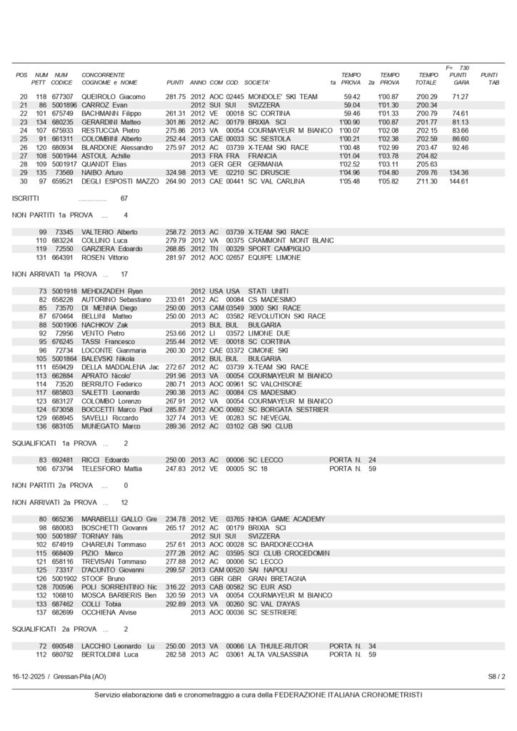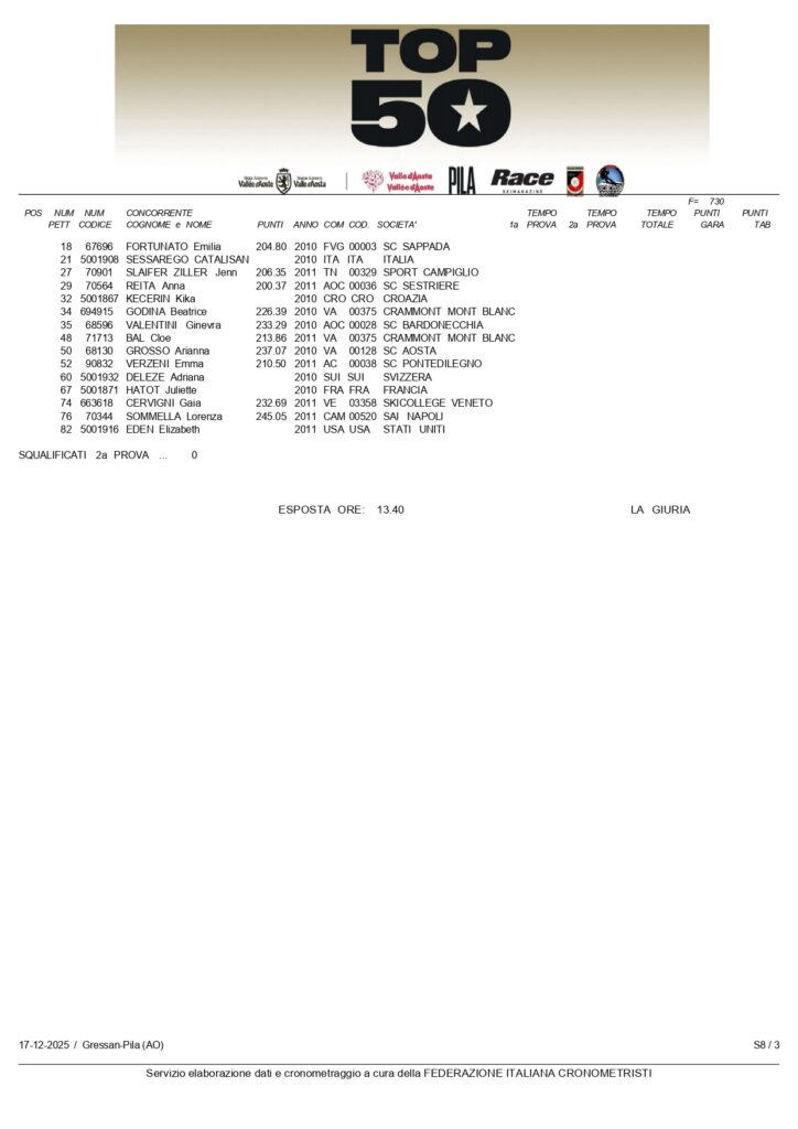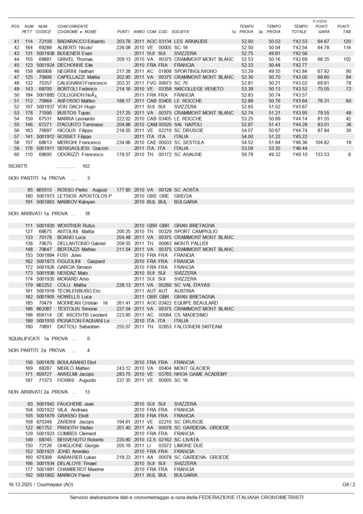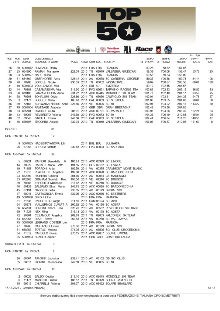 Nelle immagini: le classifiche e alcune foto dell’agenzia Acmediapress relative ad alcuni atleti del Comitato FISI Alpi Occidentali impegnati nel Top 50 a Pila e a Courmayeur
