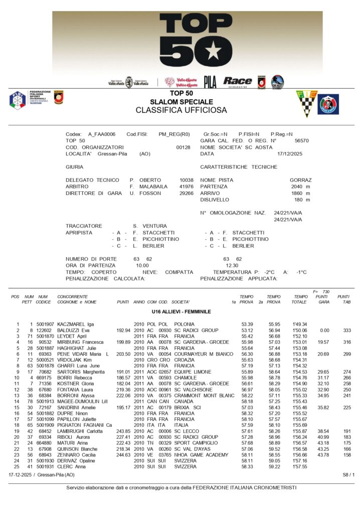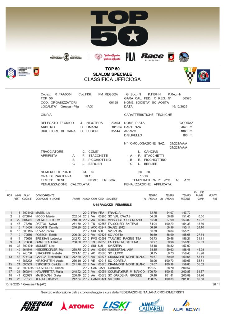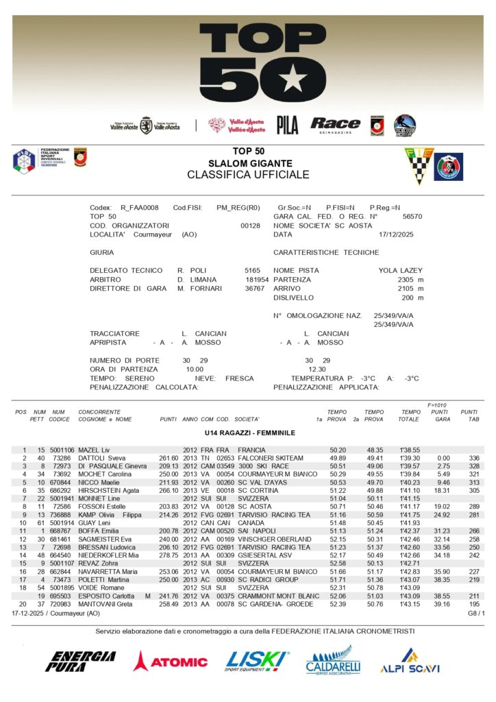 La stagione nazionale delle categorie Children si è aperta ufficialmente con il Trofeo Top 50 per Allievi e Ragazzi organizzato dallo Sci Club Aosta sulle nevi di Pila e Courmayeur. Nella prima giornata di gare gli Allievi erano impegnati in Gigante sulla pista Yola Lazey di Courmayeur. Doppietta del Comitato Alpi Occidentali in campo maschile: Felix Baldi dello Sci Club Sestriere ha vinto con il tempo totale di 1’,36”,36/100 con 93/100 di vantaggio su Niccolò Castri del Borgata Sestriere. Nei primi venti anche Pietro Magro dello Sci Club Bardonecchia, 14°, e Pietro Desogus del Borgata Sestriere, 20°. Nella prova femminile prima Maria Laura Pene Vidari dello Sci Club Courmayeur Mont Blanc, con il tempo totale di 1’,39”,93/100. Al 5° posto Laura Fontana dello Sci Club Valchisone, all’8° Vittoria Chiarelli dell’Equipe Beaulard, al 12° Cecilia Balbo del Mondolé Ski Team, al 14° Angelica Platinetti dello Sci Club Bardonecchia. Nello Slalom dei Ragazzi sulla pista Gorraz di Pila nella prova maschile primo Leonardo Fantuz dello Sci Club 18 di Cortina in 1’,49”,59/100. Decima piazza per Edoardo Cairoli dell’Equipe Limone, 13ª per Carlo Bertazzini del Borgata Sestriere, 15ª per Vittorio Cattoretti del Sestriere, 20ª per Giacomo Queirolo del Mondolè Ski Team. La gara femminile è stata dominata dalla francese Liv Mazel in 1’,47”,72/100. Quinto posto per Camilla Rigotti dello Ski Team Sauze 2012. Nella seconda giornata di gare, programma invertito e quindi Slalom per gli Allievi sulla pista Gorraz, vinto da Giovanni Ceccarelli, passato quest’anno al Fassactive, con il tempo totale di 1’,46”,49/100 e con 44/100 di vantaggio su Felix Baldi. All’11° posto Pietro Magro. La polacca Iga Kaczmarel ha vinto la gara femminile con il tempo di 1’,49”,84/100. Al 9° posto Margherita Sartoris dell’Equipe Limone, al 12° Laura Fontana. Nel Gigante Ragazzi a Courmayeur prima la francese Liv Mazel in 1’,38”,55/100. Al 24° posto Giulia Tonelli dell’asd Les Arnauds. In campo maschile ancora primo Leonardo Fantuz in 1’,41”,07/100. Al 5° posto Giacomo Queirolo, al sesto Edoardo Cairoli, al 13° Vittorio Cattoretti.