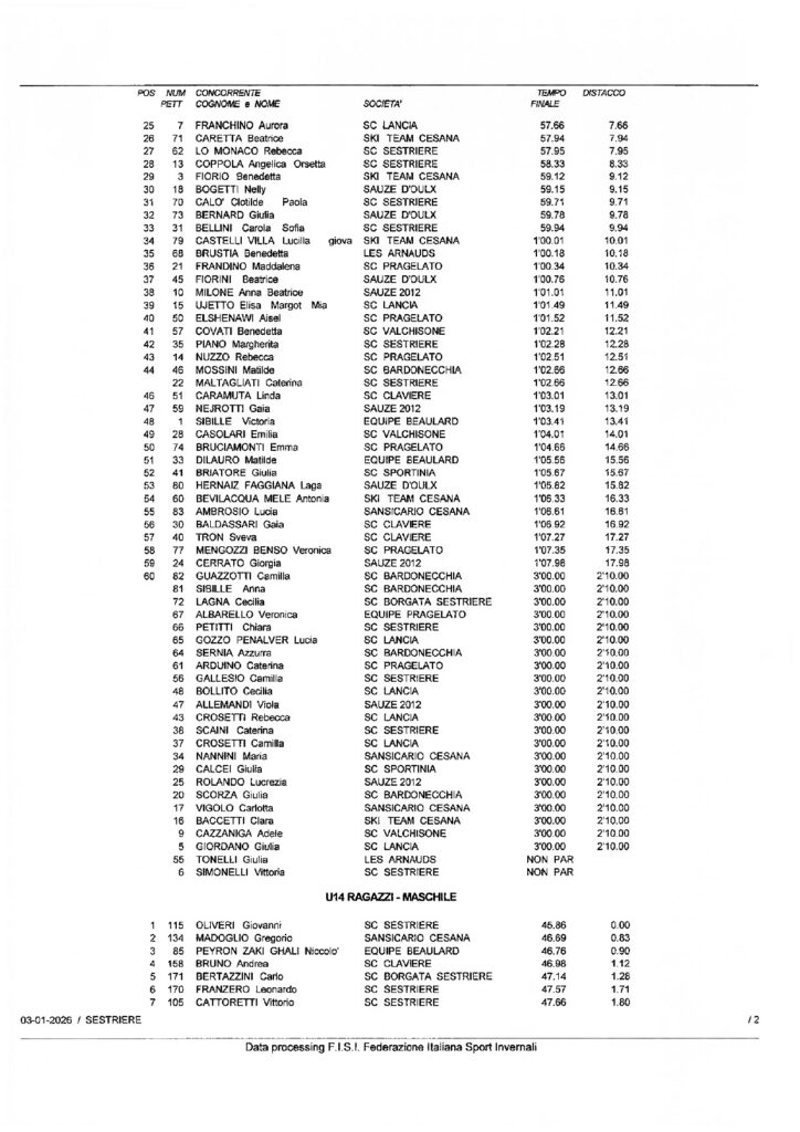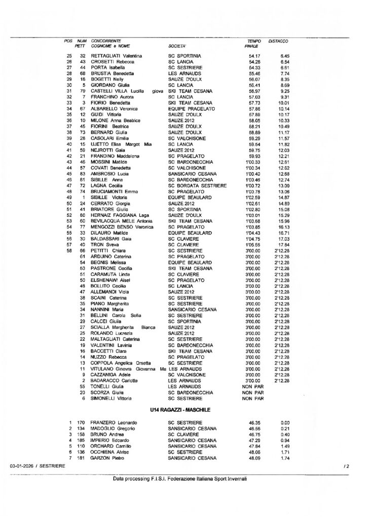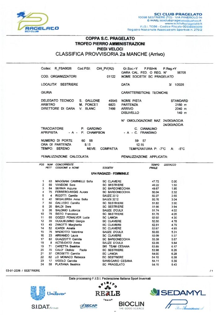 Sabato 3 gennaio a Sestriere secondo capitolo delle gare riservate alle categorie Children della Circoscrizione di Torino: la competizione con la formula “Piedi Veloci” in doppia manche sulla pista Standard era riservata ai Ragazzi ed era denominata Coppa Sci Club Pragelato-Trofeo Pierro Amministrazioni. Giovanni Oliveri dello Sci Club Sestriere ha vinto la gara 1 con il tempo di 45”,86/100 e con 83/100 di vantaggio su Gregorio Madoglio del Sansicario Cesana. Terzo a 90/100 Niccolò Peyron Zaki Ghali dell’Equipe Beaulard. Completano la top ten Andrea Bruno dello Sci Club Claviere, Carlo Bertazzini del Borgata Sestriere, Leonardo Franzero, Vittorio Cattoretti ed Alvise Occhiena del Sestriere, Edoardo Alberto Gallia del Borgata Sestriere ed Edoardo Bottino del Lancia. In campo femminile successo di Sofia Maggiani Caminelli dello Sci Club Claviere con il tempo di 50” e con distacchi rispettivamente di 2”,02/100 su Sara Vandoni del Sestriere e di 2”,46/100 su Aurora Ferrero-Regis del Bardonecchia. A seguire nelle prime dieci Anna Sofia Segalerba dello Ski Team Sauze 2012, Dora Baldi dello Sci Club Sestriere, Margherita Bianca Scialla dello Ski Team Sauze 2012, Ludovica Salonio dello Sci Club Sauze d’Oulx, Carlotta Badaracco dell’asd Les Arnauds, Lavinia Valentini dello Sci Club Bardonecchia, e Camilla Rigotti dello Ski Team Sauze 2012. Nella gara 2 vittoria di Leonardo Franzero con il tempo di 46”,35/100. Secondo a 21/100 Gregorio Madoglio, terzo a 40/100 Andrea Bruno e a seguire nella top ten Edoardo Imperio e Camillo Orchard dello Sci Club Sansicario Cesana, Alvise Occhiena, Pietro Garzon del Sansicario Cesana, Francesco Sargentini del Lancia, Edoardo Alberto Gallia, e Niccolò Peyron Zaki Ghali. Sofia Maggiani Caminelli ha vinto anche la seconda competizione femminile, questa volta in 47”,72/100, con 1”,50/100 di vantaggio su Sara Vandoni e con 1”,95/100 su Azzurra Sernia dello Sci Club Bardonecchia. A seguire nella top ten Aurora Ferrero-Regis, Camilla Rigotti, Anna Sofia Segalerba, Camilla Gallesio del Sestriere, Dora Baldi, Ludovica Salonio e infine Francesca Sisto del Sestriere.
