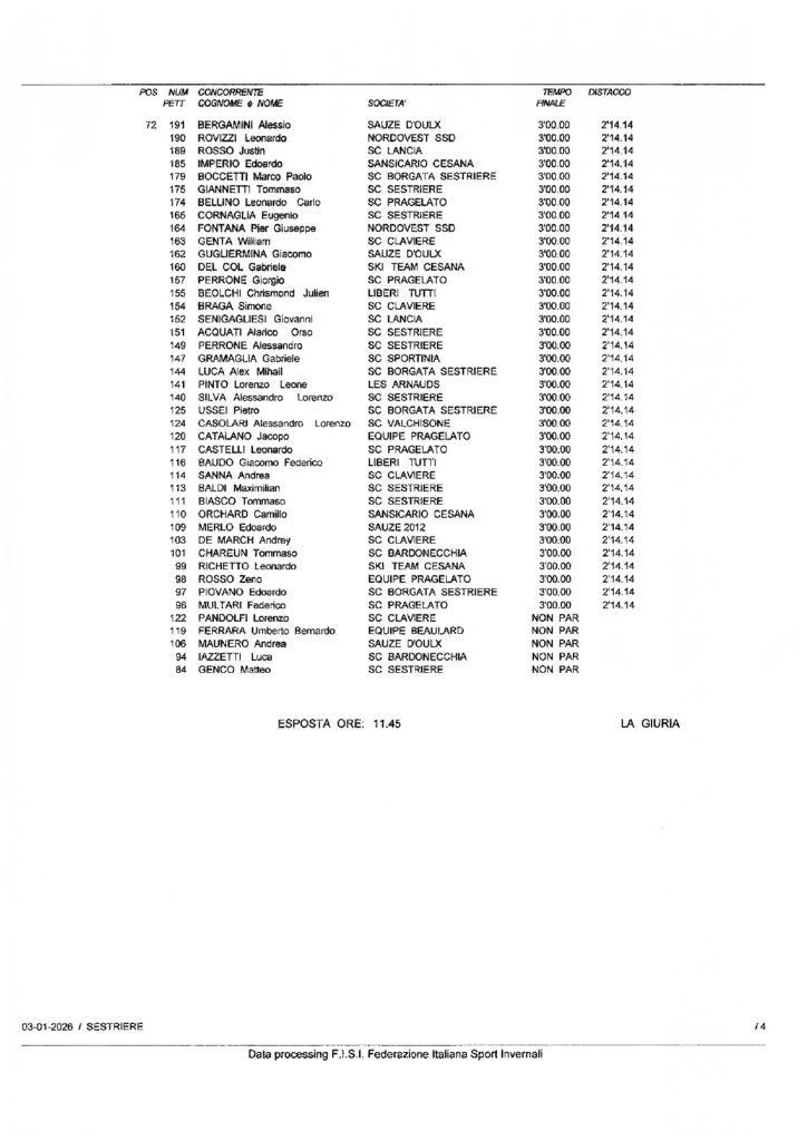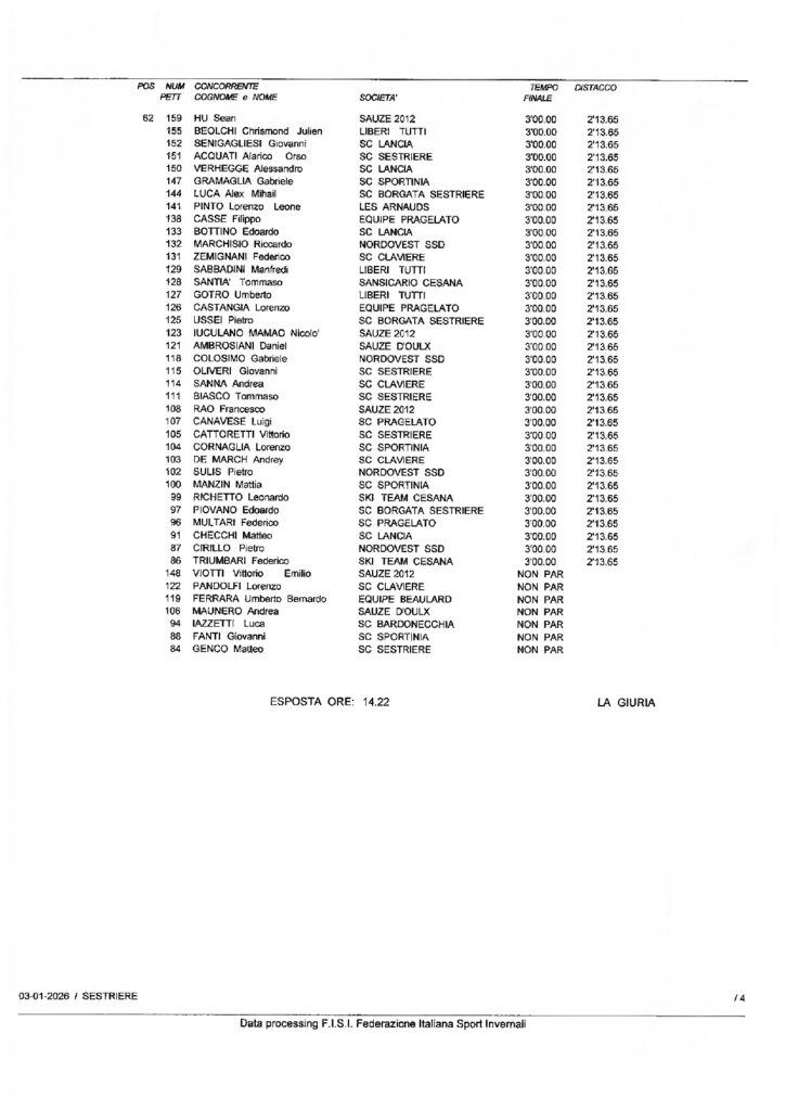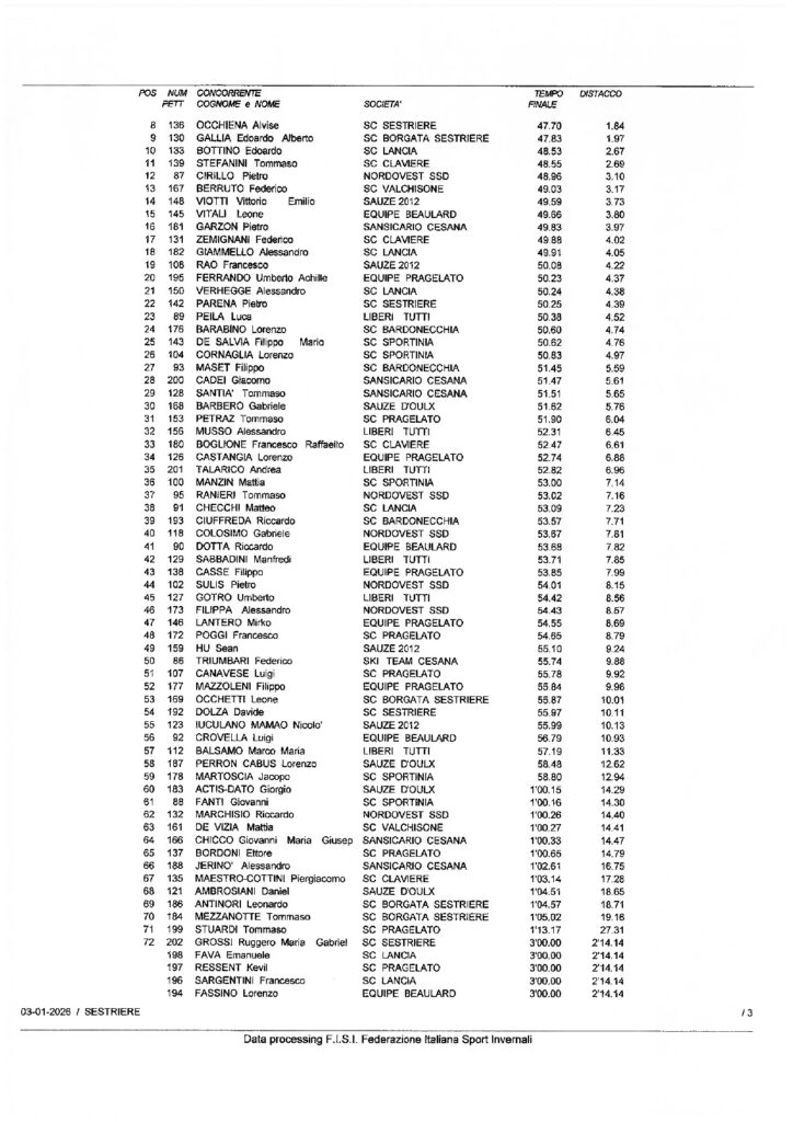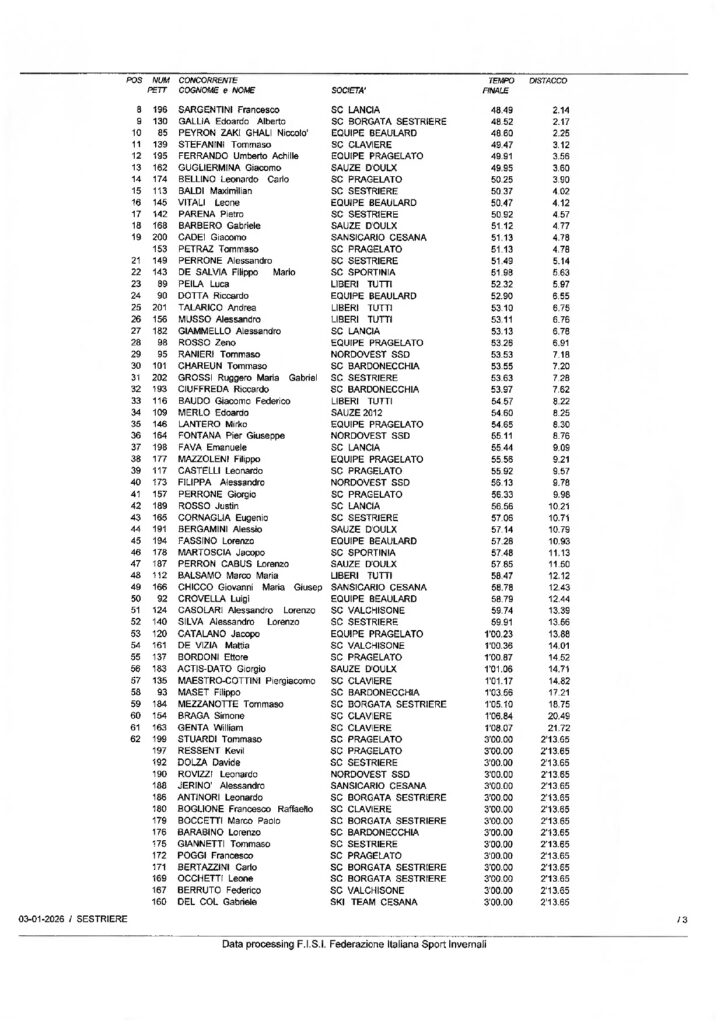 Sabato 3 gennaio a Sestriere secondo capitolo delle gare riservate alle categorie Children della Circoscrizione di Torino: la competizione con la formula “Piedi Veloci” in doppia manche sulla pista Standard era riservata ai Ragazzi ed era denominata Coppa Sci Club Pragelato-Trofeo Pierro Amministrazioni. Giovanni Oliveri dello Sci Club Sestriere ha vinto la gara 1 con il tempo di 45”,86/100 e