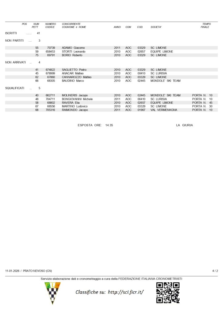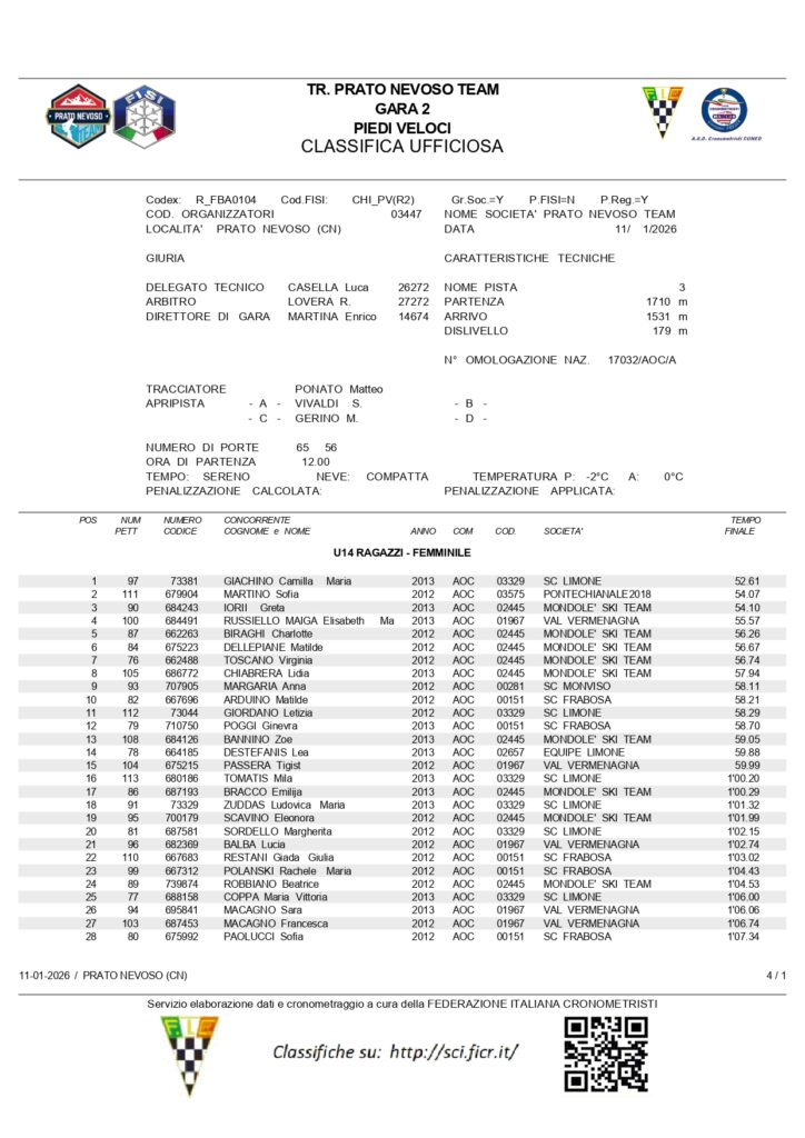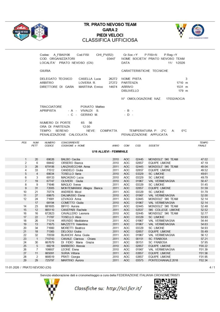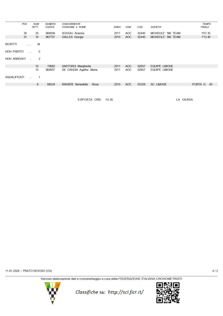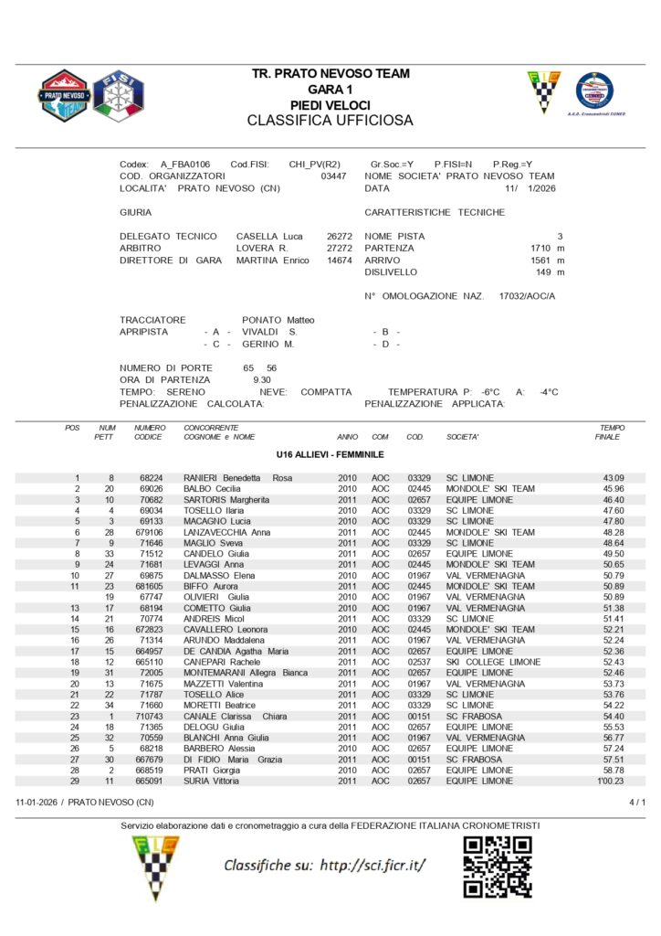 Sulla pista 3 di Prato Nevoso domenica 11 gennaio appuntamento con il Trofeo Prato Nevoso Team, una doppia prova con la formula “Piedi Veloci” per gli atleti Children della Circoscrizione di Cuneo. Nella gara 1 degli Allievi primo Romeo Calcagno del Mondolè Ski Team, con il tempo di 43”,71/100 e con un margine di 1”,60/100 sul compagno di squadra Jacopo Molineris. Terzo ad 1”,81/100 Sebastiano Dotta dell’Equipe Limone. Benedetta Rosa Ranieri dello Sci Club Limone ha vinto la prova femminile con il tempo di 43”,09/100 e con un vantaggio di 2”,87/100 su Cecilia Balbo del Mondolè Ski Team. Terza a 3”,31/100 Margherita Sartoris dell’Equipe Limone. Mondolè Ski Team a segno anche tra i Ragazzi con Giacomo Queirolo primo in in 48”,32/100, con 35/100 di margine su Giovanni La Magna Zimmermann dello Ski College Limone e 61/100 su Sebastian Calvo dello Ski College Limone. In campo femminile successo di Camilla Maria Giachino dello Sci Club Limone con il tempo di 51”,98/100 e con distacchi rispettivamente di 1”,57/100 e di 2”,30/100 su Greta Iorii e su Arabella Baldi del Mondolè Ski Team. Romeo Calcagno a segno nella categoria Allievi anche nella gara 2, con il tempo di 44”,09/100. Secondo a 59/100 Federico Scrimaglia dello Sci Club Limone, terzi a pari merito a 2”,34/100 Paolo Peira del Mondolè Ski Team e Nicolò Capecchi dello Sci Club Limone. Cecilia Balbo ha vinto la gara delle Allieve in 47”,02/100, con un margine di 17/100 su Bianca Orsero dell’Equipe Limone e di 2”,02/100 su Anna Lanzavecchia del Mondolè Ski Team. Tra i Ragazzi successo di Vittorio Rosen dell’Equipe Limone in 47”,99/100, con un vantaggio di 1” su Giovanni La Magna Zimmermann e di 1”,01/100 su Edoardo Cairoli dell’Equipe Limone. Tra le Ragazze vittoria bis di Camilla Maria Giachino in 52”,61/100, seguita ad 1”,46/100 da Sofia Martino dello Sci Club Pontechianale 2018 e ad 1”,49/100 da Greta Iorii.