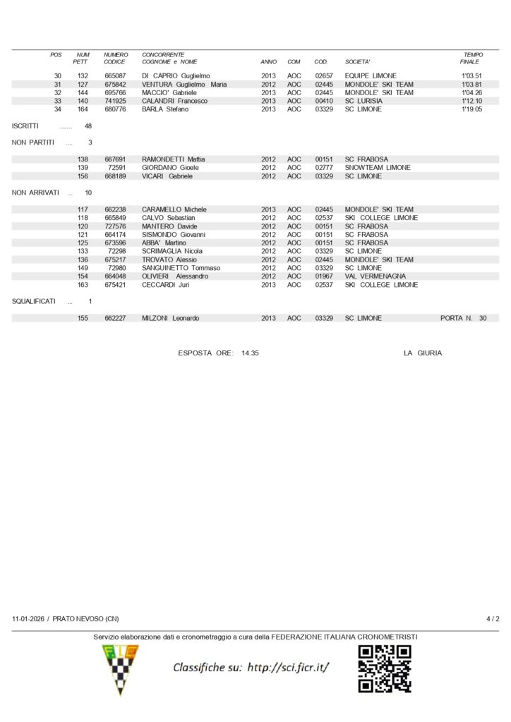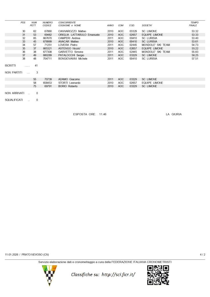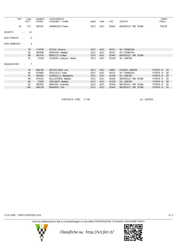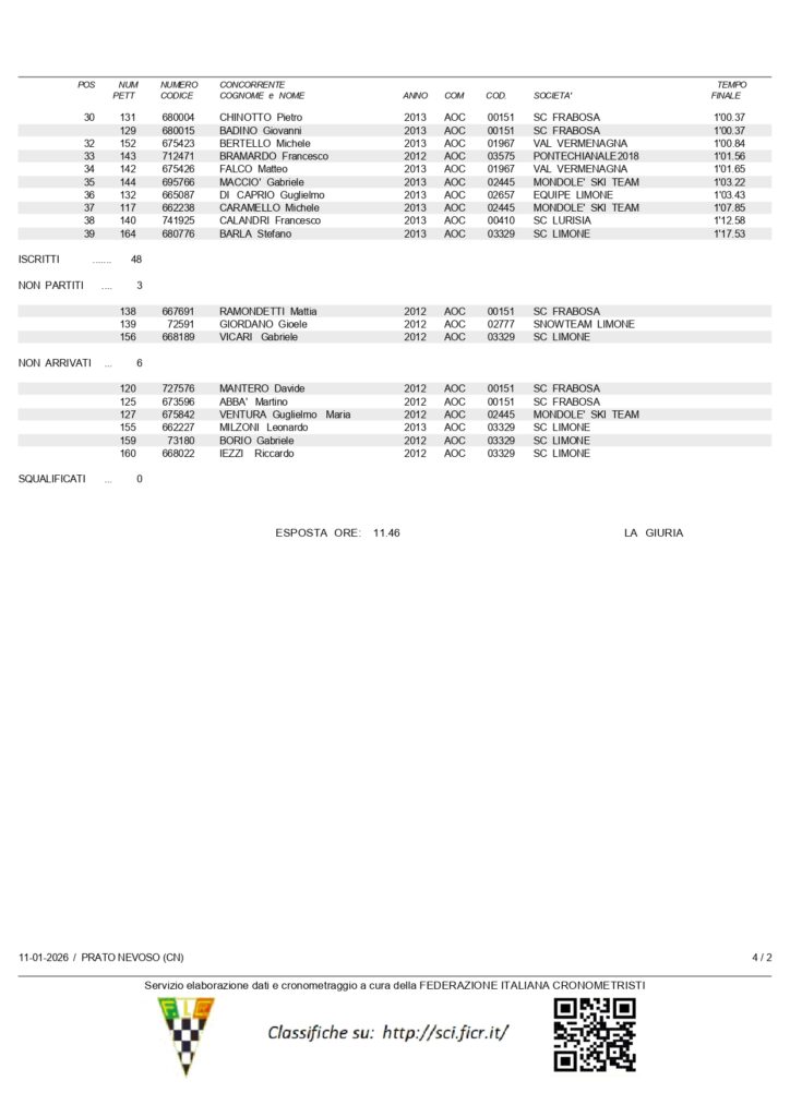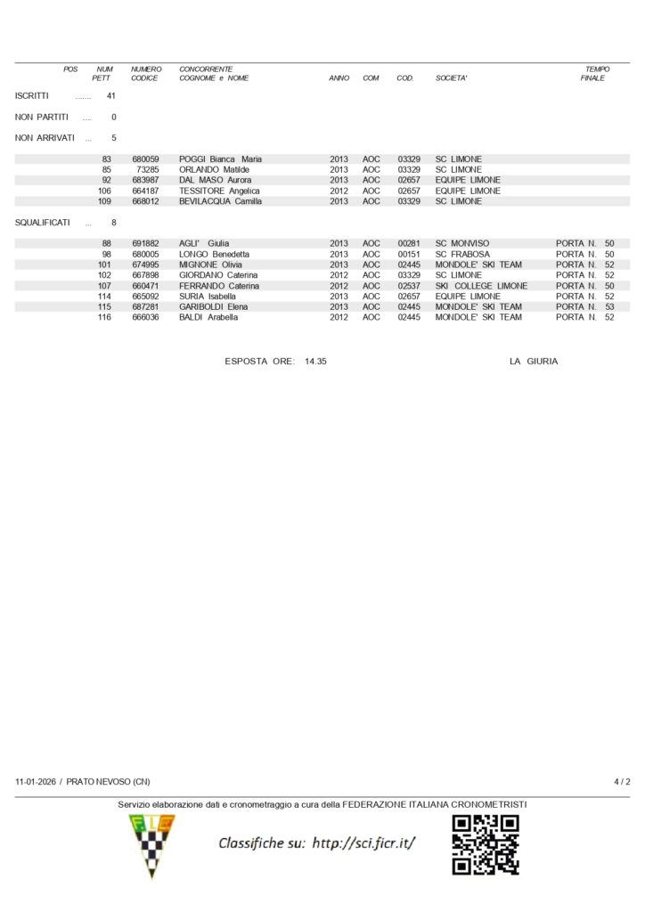 Sulla pista 3 di Prato Nevoso domenica 11 gennaio appuntamento con il Trofeo Prato Nevoso Team, una doppia prova con la formula “Piedi Veloci” per gli atleti Children della Circoscrizione di Cuneo. Nella gara 1 degli Allievi primo Romeo Calcagno del Mondolè Ski Team, con il tempo di 43”,71/100 e con un margine di 1”,60/100 sul compagno di squadra Jacopo Molineris. Terzo ad 1”,81/100 Sebastiano Dotta dell’Equipe Limone. Benedetta Rosa Ranieri dello Sci Club Limone ha vinto la prova femminile con il tempo di 43”,09/100 e con un vantaggio di 2”,87/100 su Cecilia Balbo del Mondolè Ski Team. Terza a 3”,31/100 Margherita Sartoris dell’Equipe Limone. Mondolè Ski Team a segno anche tra i Ragazzi con Giacomo Queirolo primo in in 48”,32/100, con 35/100 di margine su Giovanni La Magna Zimmermann dello Ski College Limone e 61/100 su Sebastian Calvo dello Ski College Limone. In campo femminile successo di Camilla Maria Giachino dello Sci Club Limone con il tempo di 51”,98/100 e con distacchi rispettivamente di 1”,57/100 e di 2”,30/100 su Greta Iorii e su Arabella Baldi del Mondolè Ski Team. Romeo Calcagno a segno nella categoria Allievi anche nella gara 2, con il tempo di 44”,09/100. Secondo a 59/100 Federico Scrimaglia dello Sci Club Limone, terzi a pari merito a 2”,34/100 Paolo Peira del Mondolè Ski Team e Nicolò Capecchi dello Sci Club Limone. Cecilia Balbo ha vinto la gara delle Allieve in 47”,02/100, con un margine di 17/100 su Bianca Orsero dell’Equipe Limone e di 2”,02/100 su Anna Lanzavecchia del Mondolè Ski Team. Tra i Ragazzi successo di Vittorio Rosen dell’Equipe Limone in 47”,99/100, con un vantaggio di 1” su Giovanni La Magna Zimmermann e di 1”,01/100 su Edoardo Cairoli dell’Equipe Limone. Tra le Ragazze vittoria bis di Camilla Maria Giachino in 52”,61/100, seguita ad 1”,46/100 da Sofia Martino dello Sci Club Pontechianale 2018 e ad 1”,49/100 da Greta Iorii.