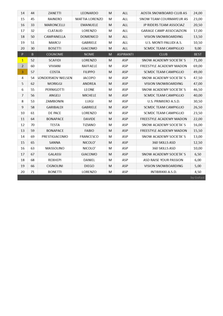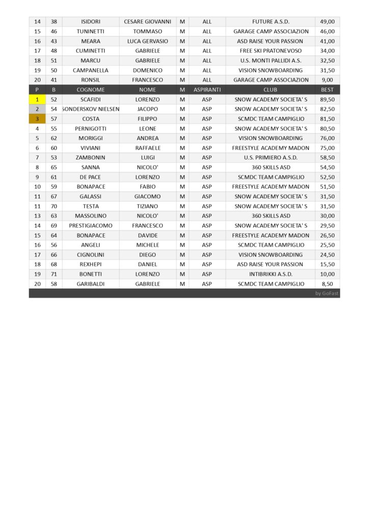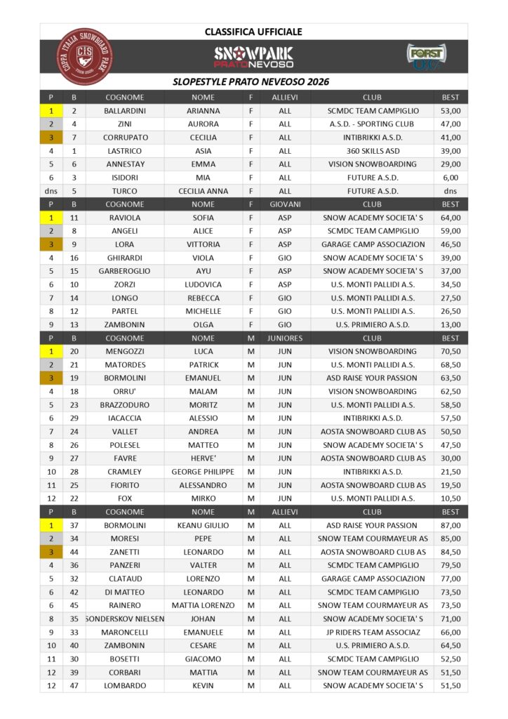 Sabato 17 e domenica 18 gennaio allo Snowpark di Prato Nevoso è tornato un appuntamento classico, quello con la Coppa Italia di snowboard. Nello Slopestyle Giovani femminile prima Sofia Raviola della Snow Academy Prato Nevoso con 64 punti, davanti ad Alice Angeli dello Snowboard Club Madonna di Campiglio Team con 59 e a Vittoria Lora del Garage Camp Bardonecchia con 46,50. Quarta e quinta Viola Ghirardi e Ayu Garberoglio della Snow Academy Prato Nevoso. Tra le Allieve prima Arianna Ballardini dello Snowboard Club Madonna di Campiglio Team con 53 punti, seguita da Aurora Zini dell’asd Sporting Club con 47 e da Cecilia Corrupato dell’asd Intibrikki. Quinta Emma Annestay della società Vision Snowboarding di Sauze d’Oulx. Luca Mengozzi della Vision Snowboarding ha vinto tra gli Juniores con 70,50 punti, precedendo Patrick Matordes dell’Unione Sportiva Monti Pallidi con 68,50 ed Emanuel Bormolini dell’asd Raise Your Passion con 63,50. Quarto il genovese Malam Orrù della Vision Snowboarding, ottavo Matteo Polesel della Snow Academy Prato Nevoso. Nella categoria Aspiranti doppietta della Snow Academy Prato Nevoso: primo Lorenzo Scafidi con 89,50, davanti a Jacopo Sonderskov Nielsen con 82,50, terzo Filippo Costa dello Snowboard Club Madonna di Campiglio Team, quarto Leone Pernigotti della Snow Academy Prato Nevoso, quinto Andrea Moriggi della Vision Snowboarding. Tra gli Allievi vittoria di Keanu Giulio Bormolini dell’asd Raise Your Passion con 87 punti. Sul podio anche Pepe Moresi dello Snow Team Courmayeur con 85 e Leonardo Zanetti dell’Aosta Snowboard Club. Quinta piazza per Lorenzo Clataud del Garage Camp e ottava per Johan Sonderskov Nielsen della Snow Academy Prato Nevoso. La seconda prova in programma era il Rail Jam. Tra le Giovani prima Olga Zambonin dell’Unione Sportiva Primiero con 51 punti, seconda Vittoria Lora del Garage Camp con 49, terza Sofia Raviola con 41 e quarta Ayu Garberoglio. Aurora Zini ha vinto la competizione delle nelle Allieve con 69 punti, davanti ad Arianna Ballardini con 45 e a Cecilia Corrupato, con al settimo posto Emma Annestay. Doppietta di Luca Mengozzi tra gli Juniores con 72 punti, davanti a Malam Orrù con 70 e ad Emanuel Bormolini con 58. Al decimo posto Matteo Polesel. Lorenzo Scafidi ha vinto nella categoria Aspiranti con 71 punti, seguito da Raffaele Viviani della Freestyle Academy Madonna di Campiglio con 69 e da Filippo Costa dello Snowboard Club Madonna di Campiglio Team con 49. Al quarto posto Jacopo Sonderskov Nielsen, al quinto Andrea Moriggi, al sesto Leone Pernigotti. Leonardo Di Matteo dello Snowboard Club Madonna di Campiglio Team ha vinto tra gli Allievi con 67 punti, davanti a Cesare Zambonin dell’Unione Sportiva Primiero con 61 e a Cesare Giovanni Isidori del Future asd con 51. Al sesto posto Johan Sonderskov Nielsen, al settimo Kevin Lombardo della Snow Academy Prato Nevoso, al nono Gabriele Cuminetti del Freeski Prato Nevoso, al decimo Francesco Ronsil del Garage Camp.
