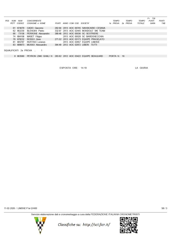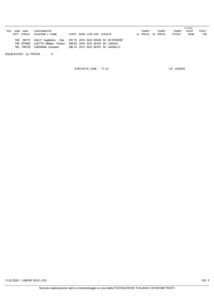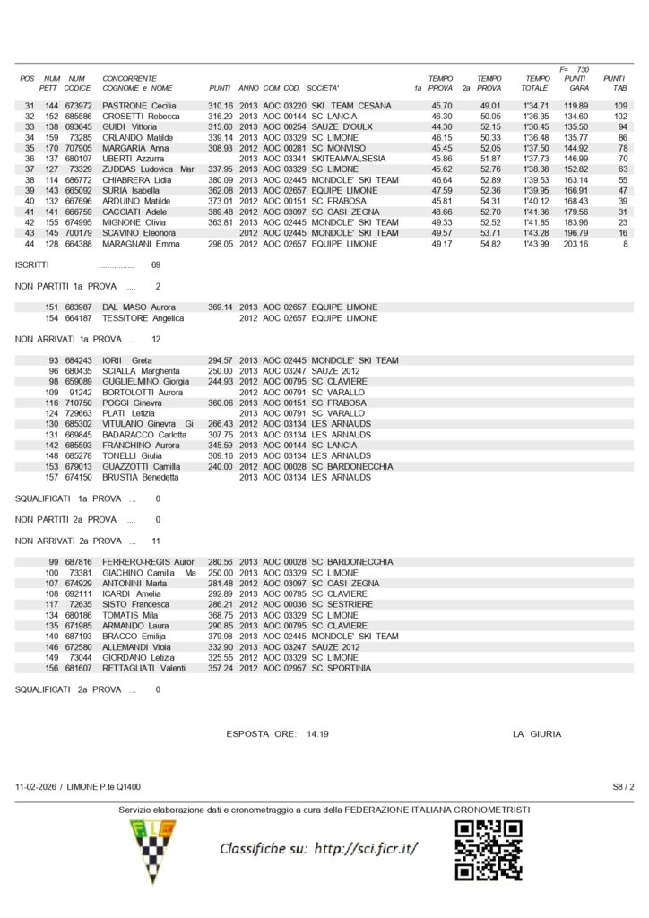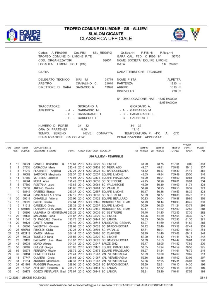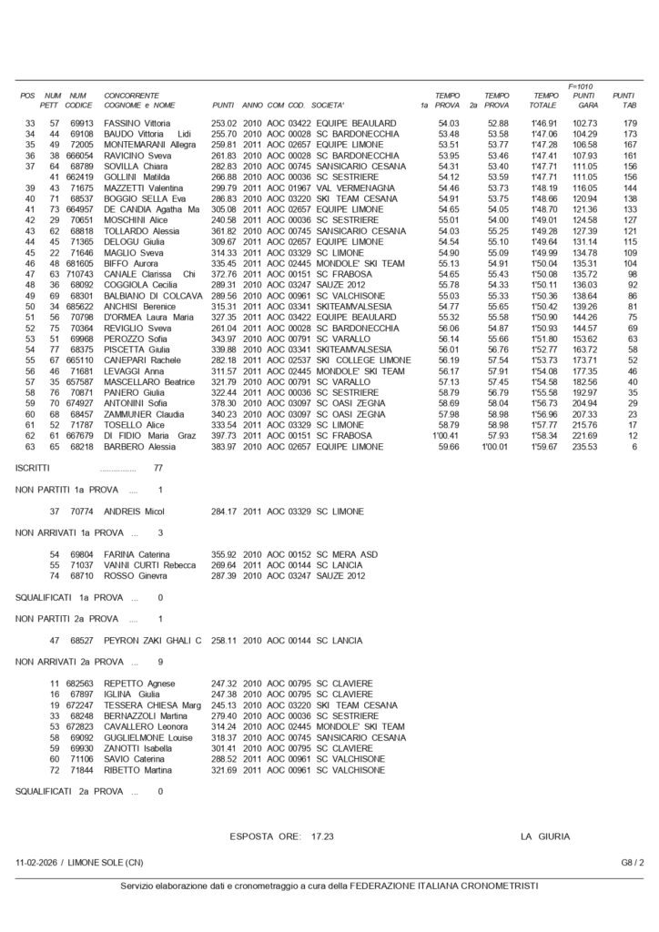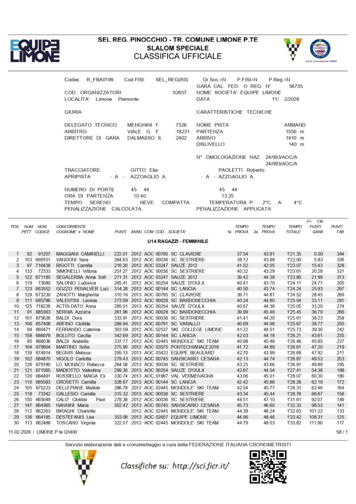 Dopo il Gigante, Sofia Maggiani Caminelli dello Sci Club Claviere ha vinto anche la gara femminile tra le porte strette, fermando i cronometri sul tempo di 1’,21”,35/100, con 65/100 di margine su Sara Vandoni dello Sci Club Sestriere e con 1”,72/100 su Camilla Rigotti dello Ski Team Sauze 2012. Al quarto posto Vittoria Simonelli dello Sci Club Sestriere e a seguire nelle prime dieci Anna Sofia Segalerba dello Ski Team Sauze 2012, Ludovica Salonio dello Sci Club Sauze d’Oulx, Lucia Gozzo Penalver del Lancia, Margherita Zanotti del Claviere, Lavina Valentini del Bardonecchia e Anna Actis-Dato del Sauze d’Oulx.