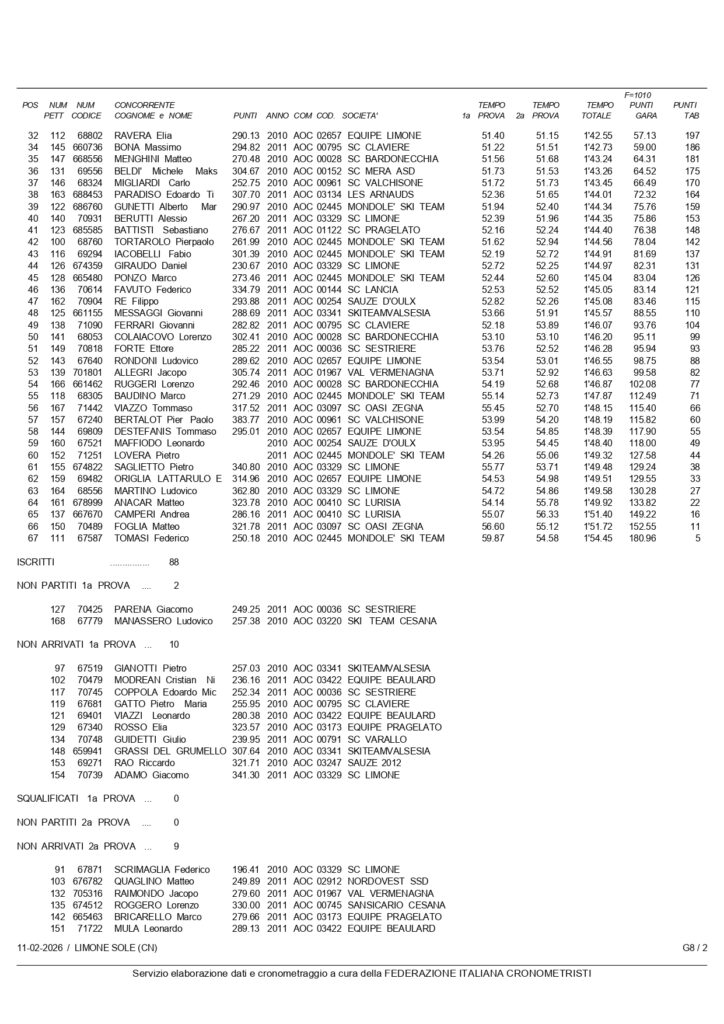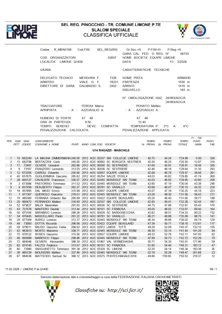 Mercoledì 11 febbraio a Limone Piemonte si sono concluse le selezioni regionali in vista del Trofeo Pinocchio sugli Sci, in programma nel mese di marzo all’Abetone. Gli Allievi hanno gareggiato nel Gigante organizzato dall’Equipe Limone in collaborazione con lo Ski College Limone sulla pista Alpetta. Successo in campo maschile di Felix Baldi dello Sci Club Sestriere con il tempo totale di 1’,37”,06/100 seguito a 69/100 da Niccolò Castri del Borgata Sestriere e a 77/100 da Mattia Croce dello Sci Club Lancia. A seguire nei primi dieci Pietro Magro dello Sci Club Bardonecchia, Lorenzo Biraghi del Sestriere, Paolo Peira del Mondolè Ski Team, Pier Giacomo Barabino dello Sci Club Bardonecchia, Matteo Guaschino del Varallo, Romeo Calcagno del Mondolè Ski Team e Filippo Braida-Bruno del Sauze d’Oulx. La milanese Benedetta Rosa Ranieri dello Sci Club Limone ha vinto la gara femminile con il tempo totale di 1’,37”,04/100, staccando di 1”,84/100 Maria Casaccia dello Sci Club Mera e di 2”,35/100 Angelica Platinetti del Bardonecchia. Completano la top ten Margherita Sartoris dell’Equipe Limone, Ludovica Vottero dell’Equipe Pragelato, Anna Reita dello Sci Club Sestriere, Laura Fontana del Valchisone, Camilla Arfino del Varallo e Bianca Orsero dell’Equipe Limone ottave pari merito e infine Emma Castagnola dello Sci Club Sestriere. Il programma per i Ragazzi prevedeva invece lo Slalom sulla pista Giorgio Armand di Limone 1400. Successo di Giovanni La Magna Zimmermann dello Ski College Limone nella gara maschile, con il crono complessivo di 1’,24”,99/100 e con distacchi rispettivamente di 1”,51/100 e di 1”,92/100 su Carlo Bertazzini dello Sci Club Borgata Sestriere e su Giovanni Oliveri del Sestriere. Dal quarto al decimo posto in classifica troviamo Leonardo Franzero dello Sci Club Sestriere, Edoardo Cairoli dell’Equipe Limone, Giacomo Gugliermina dello Sci Club Sauze d’Oulx, Francesco Cavalieri e Tommaso Pastorino del Mondolè Ski Team, Filippo Dealberto dello Sci Club Varallo ed Enrico Dal Maso dell’Equipe Limone.