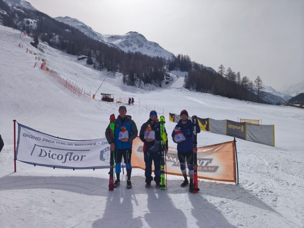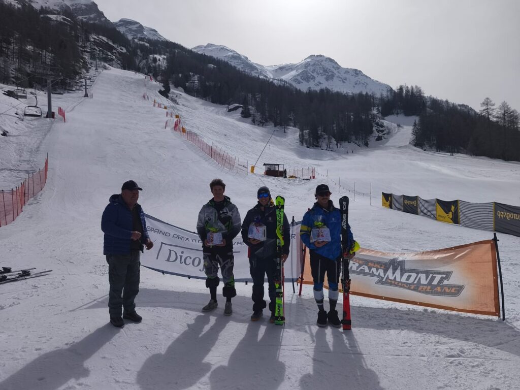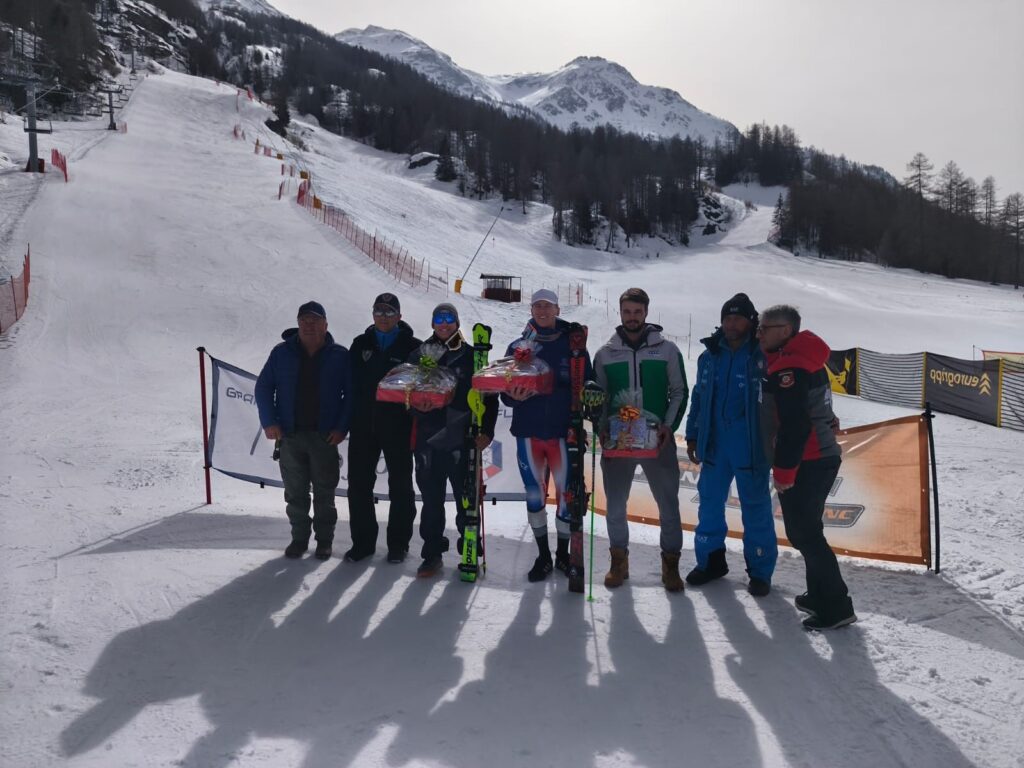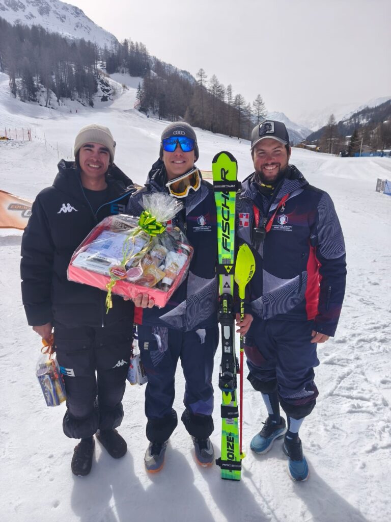 Nelle foto: Francesco Sadowski con i tecnici del Comitato FISI Alpi Occidentali e dell’Equipe Limone e le premiazioni del secondo Slalom FIS di Valgrisenche valido per il Grand Prix Italia