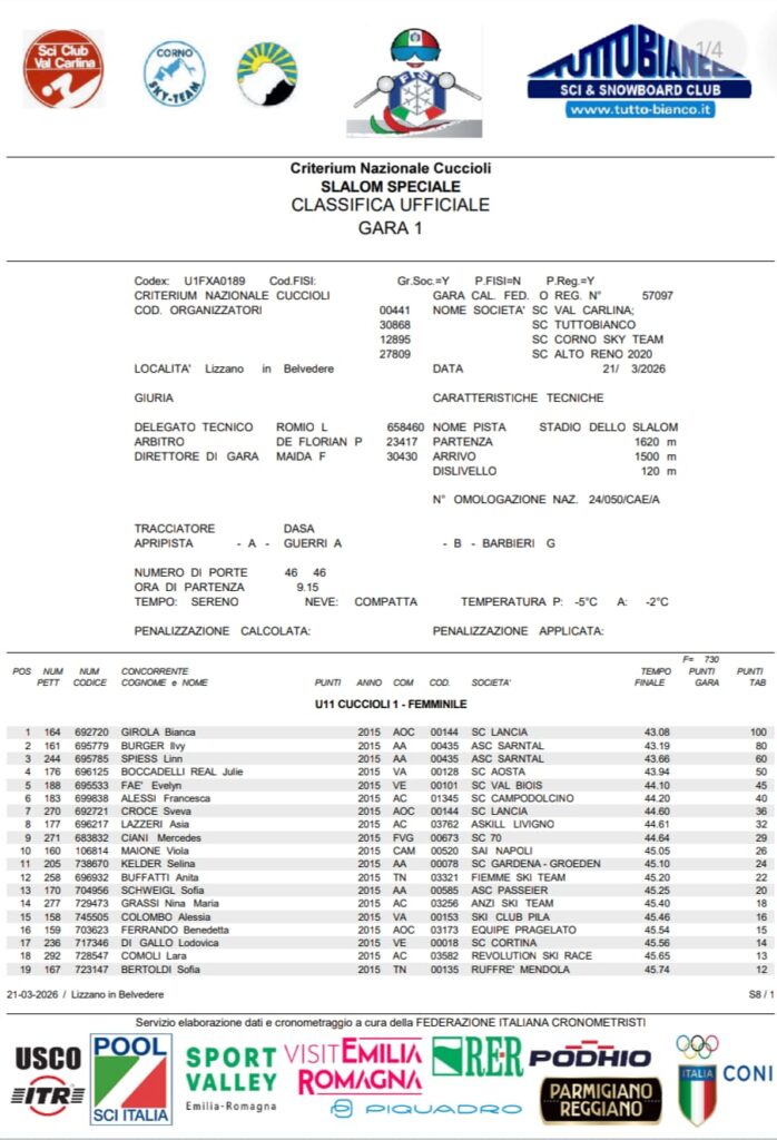 Ed è cominciato così il Criterium Nazionale Cuccioli che si chiuderà domani al Corno alle Scale. In allegato le classifiche della prima giornata, con le gare che si sono svolte in una splendida giornata di sole e con piste perfettamente innevate e curate dagli sci club locali e dai maestri sci del Corno alle Scale.