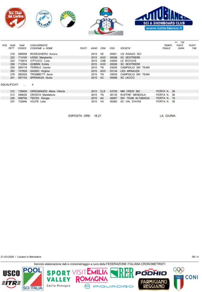 Una prima giornata straordinaria sia sulle piste nella splendida sfilata dei ragazzi, fino al saluto, all’interno del palazzetto dello sport di Lizzano in Belvedere da parte di Alberto Tomba e Flora Tabanelli, la quale, anche se con le stampelle, dopo l’operazione al crociato, non si è sottratta all’entusiasmo dei piccoli atleti, firmando autografi e posando per centinaia di selfie. Ed