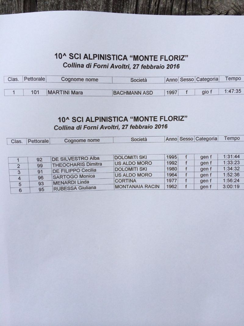 Pronostici rispettati nella decima edizione della Sci Alpinistica Monte Floriz, prova del calendario FISI FVG 2015-2016 organizzata a Collina di Forni Avoltri da ASD Monte Coglians e US Collina.