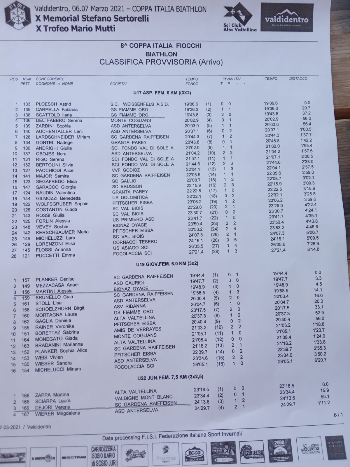 Dopo la sprint 8 colpi di ieri, oggi so è svolta la sprint tradizionale, che ha visto l’ennesima grande prova di squadra stagionale delle Aspiranti della squadra FISI FVG, con Astrid Plösch del Weissenfels (allenata dallo staff del Bachmann) vincitrice della 6 km grazie ad una perfetta serie al poligono, la Fiamme Oro Ilaria Scattolo terza (2) e Serena Del Fabbro quarta (1).