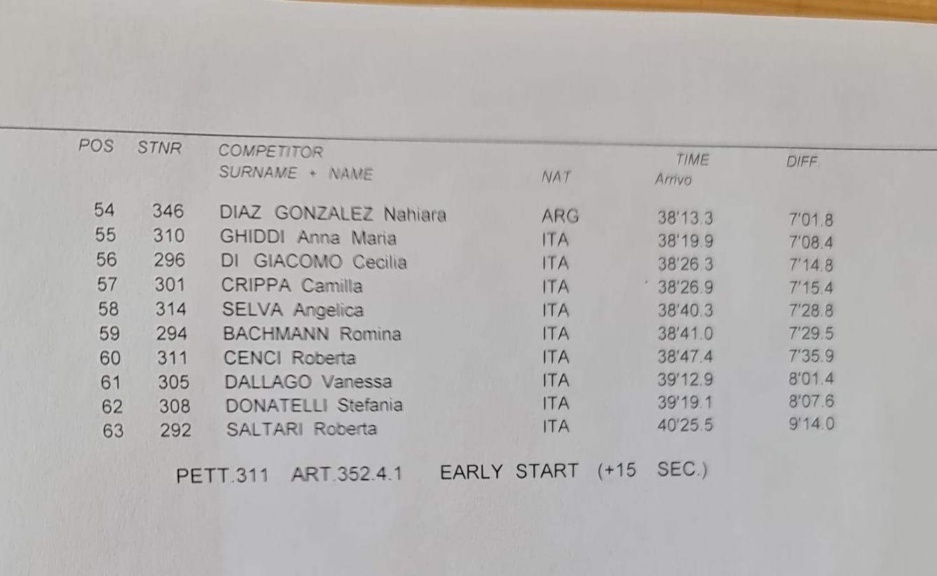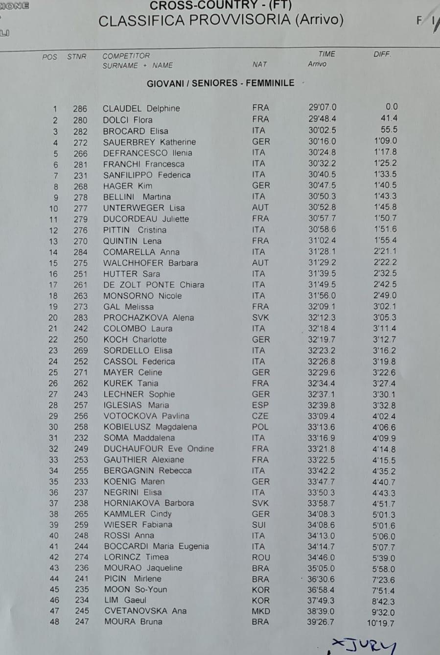 Infine la prova U20 femminile, con il settimo posto di Maria Gismondi nella gara vinta da Denise Dedei; Aurora Morassi ha concluso 53a.