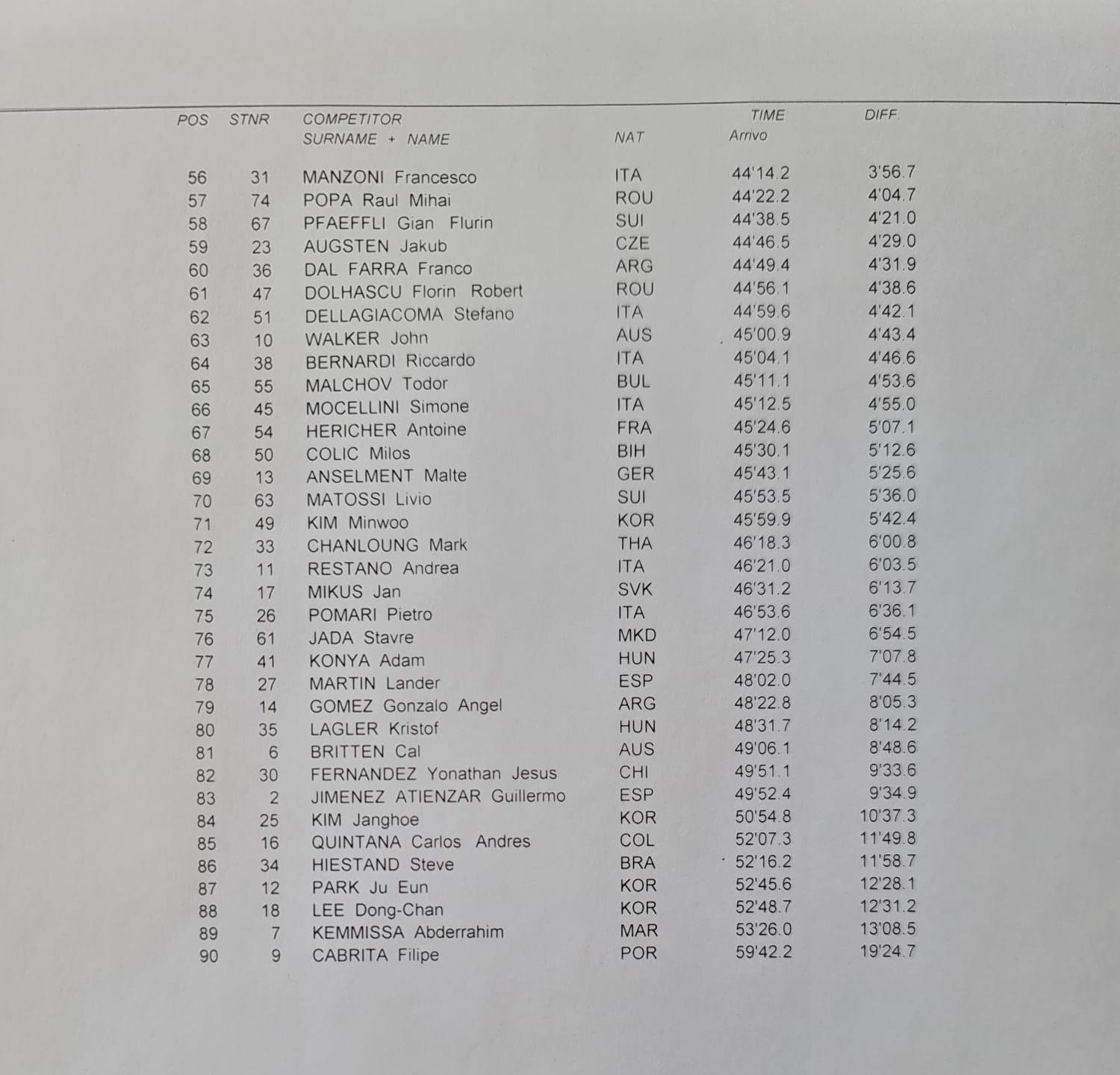 In gara anche Luca Del Fabbro (16° a 1’59”), Giuseppe Montello (19° a 2’07”), Davide Graz (33° a 2’28”) e Luca Sclisizzo (48° a 3’21”).