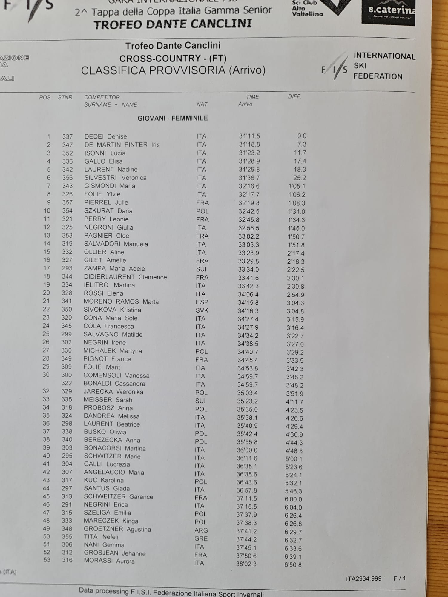 Cristina Pittin è giunta dodicesima nella FIS, sesta nella graduatoria di Coppa Italia. Rebecca Bergagnin della Monte Coglians ha chiuso rispettivamente 34a e 15a.
