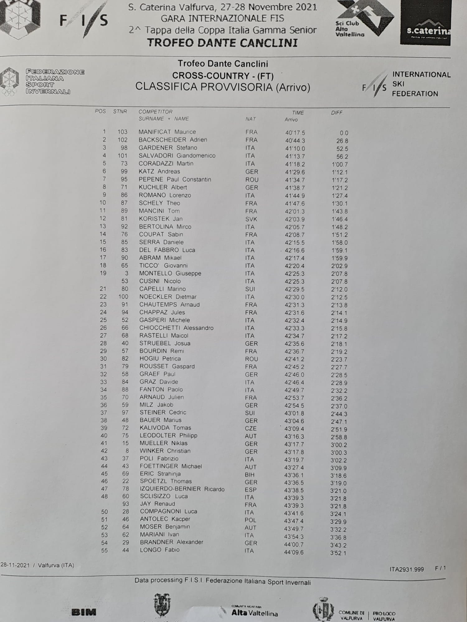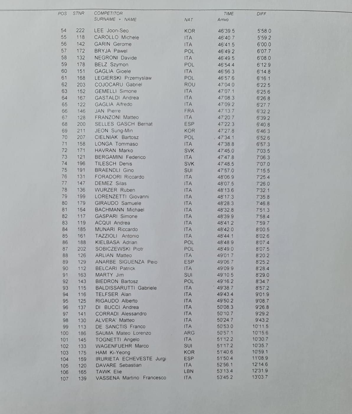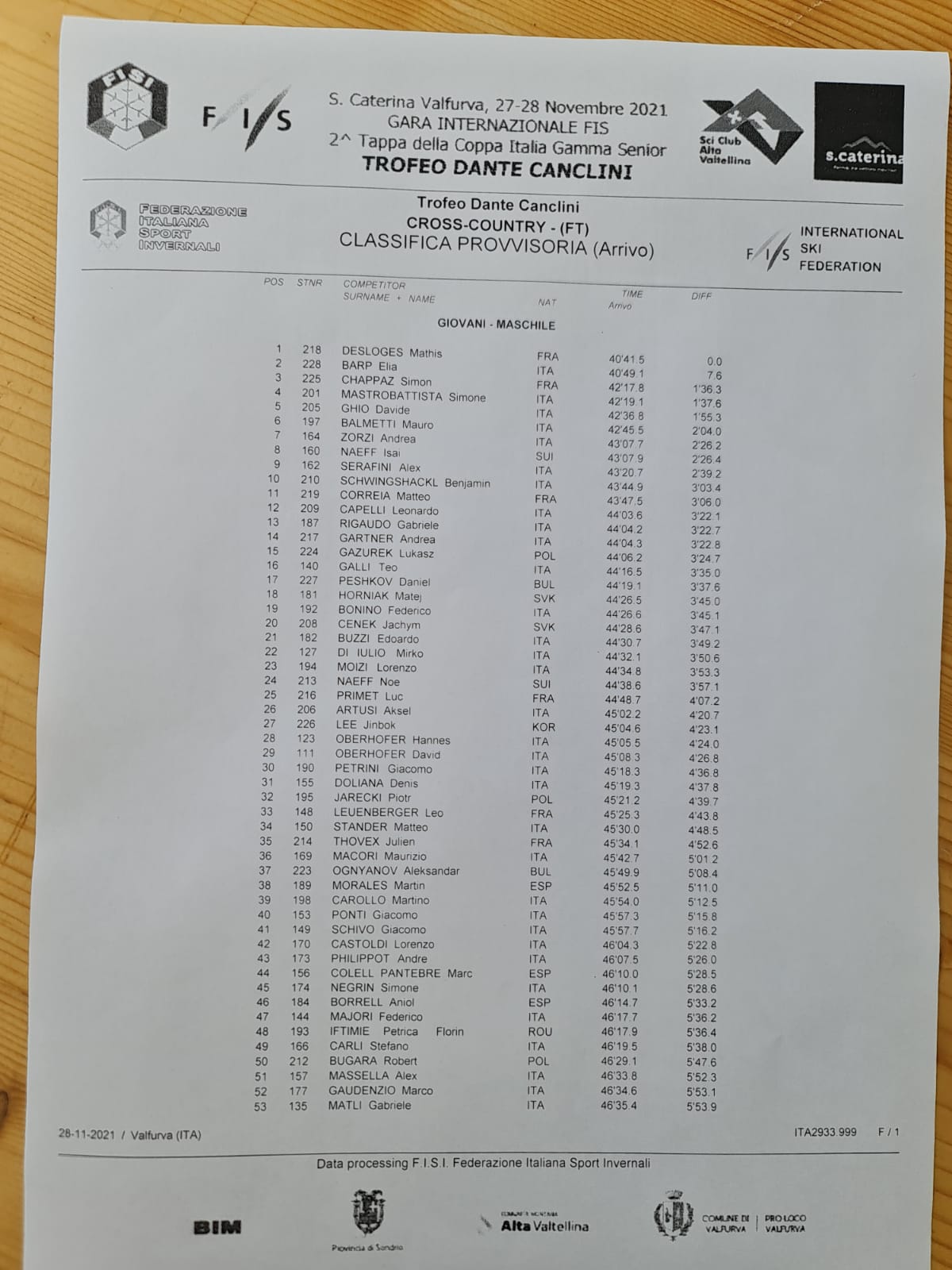 Nella prova Under 20 Andrea Gartner si è piazzato 14° a 3’22” dal vincitore, il francese Desloges, mentre nella graduatoria di Coppa Italia Giovani è decimo a 3’15” dal dominatore Elia Barp.