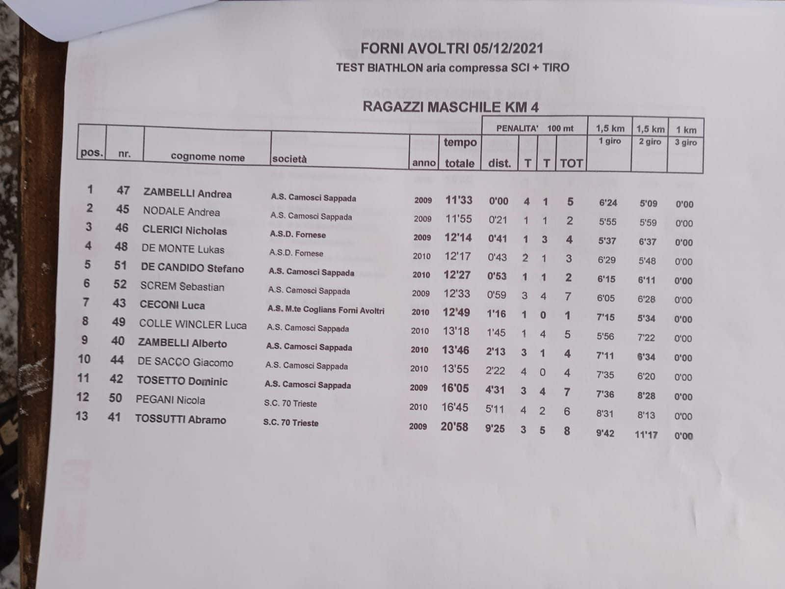 Per quanto riguarda la sprint del settore aria compressa, nella 5 km Allievi Manuel Iorio dei Camosci (1) precede di 47″ il compagno di squadra Filippo Tach (4) e di 1’36” l’altro esponente del sodalizio sappadino Samuele Degano (3).