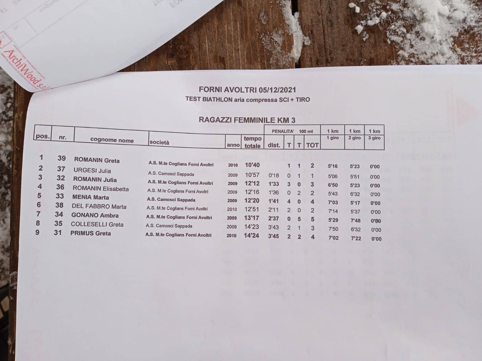 Infine la 3 km Ragazze, con in testa Greta Romanin della Monte Coglians (2), Julia Urgesi dei Camosci (1) seconda a 18″ e Julia Romanin della Coglians (3) terza a 1’33”.