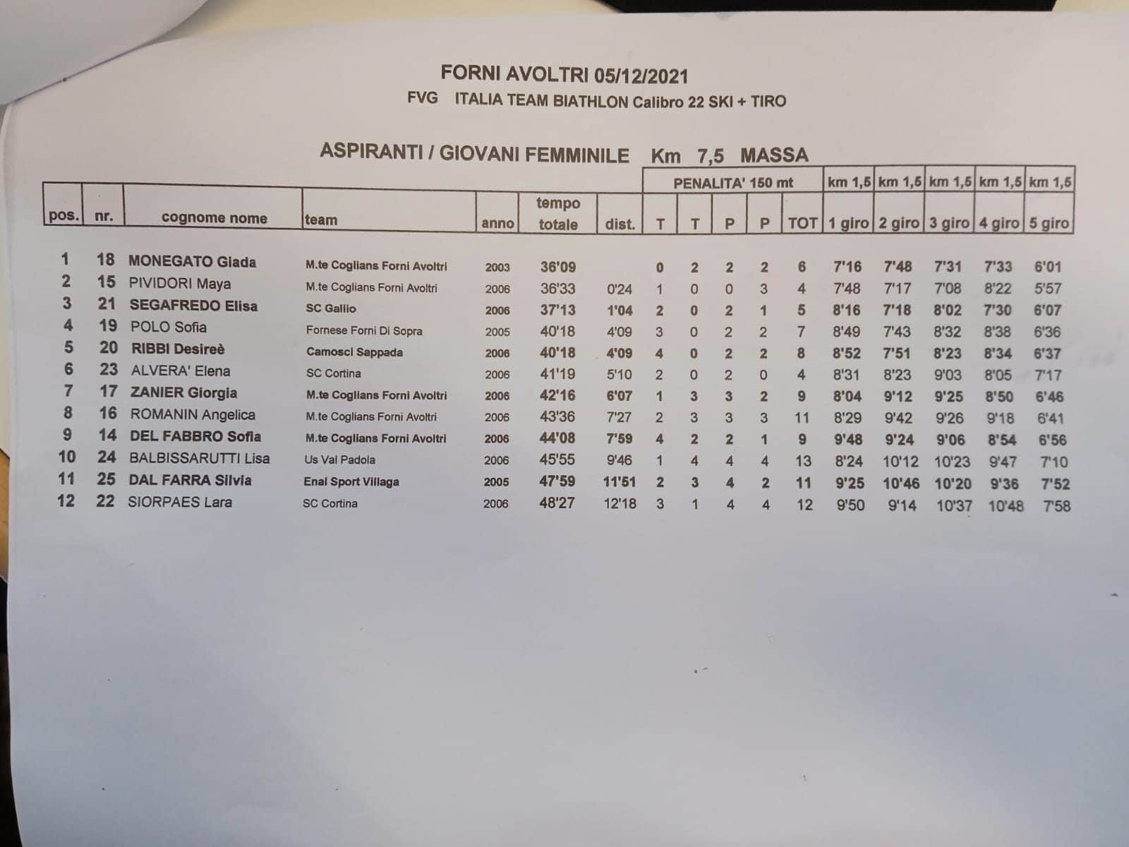 Nella 7.5 km mass start Aspiranti/Giovani femminile migliore tempo per Giada Monegato della Monte Coglians (6) con 24″ sulla compagna di squadra Maya Pividori (4), la migliore delle Aspiranti, e 1’04” su Elisa Segafredo dello Sci Club Gallio (Veneto).