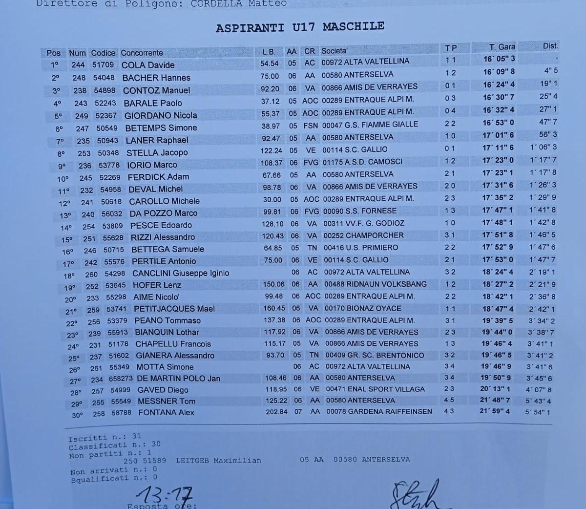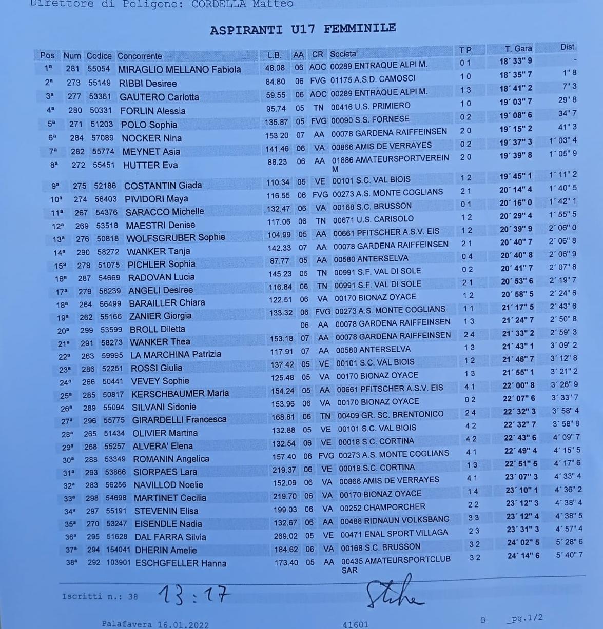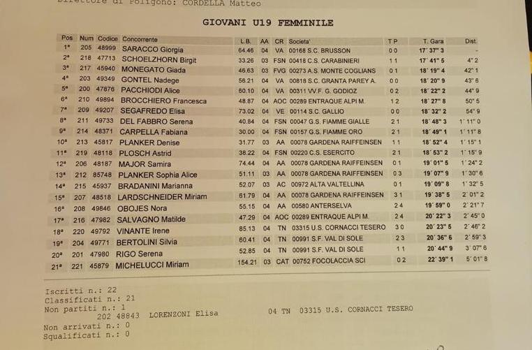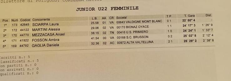 Successivamente si sono svolte le prove Aspiranti, con Desiree Ribbi dei Camosci a soli 1″8 dal primo posto. Quinta Sophia Polo della Fornese, decima Maya Pividori della Monte Coglians.