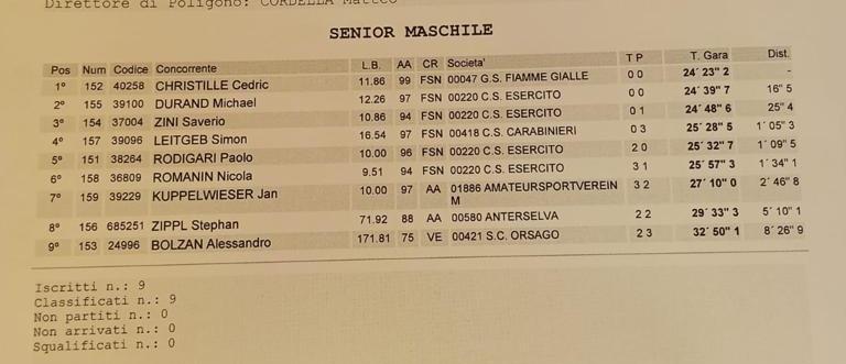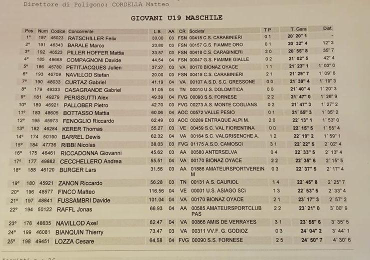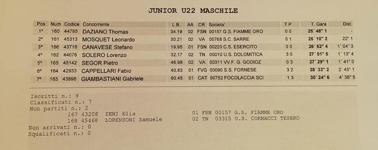 Un terzo posto anche nei Giovani maschile con Mattia Piller Hoffer del Cs Carabinieri, mentre Alex Perissutti della Fornese è nono davanti a Pietro Pallober della Monte Coglians.
