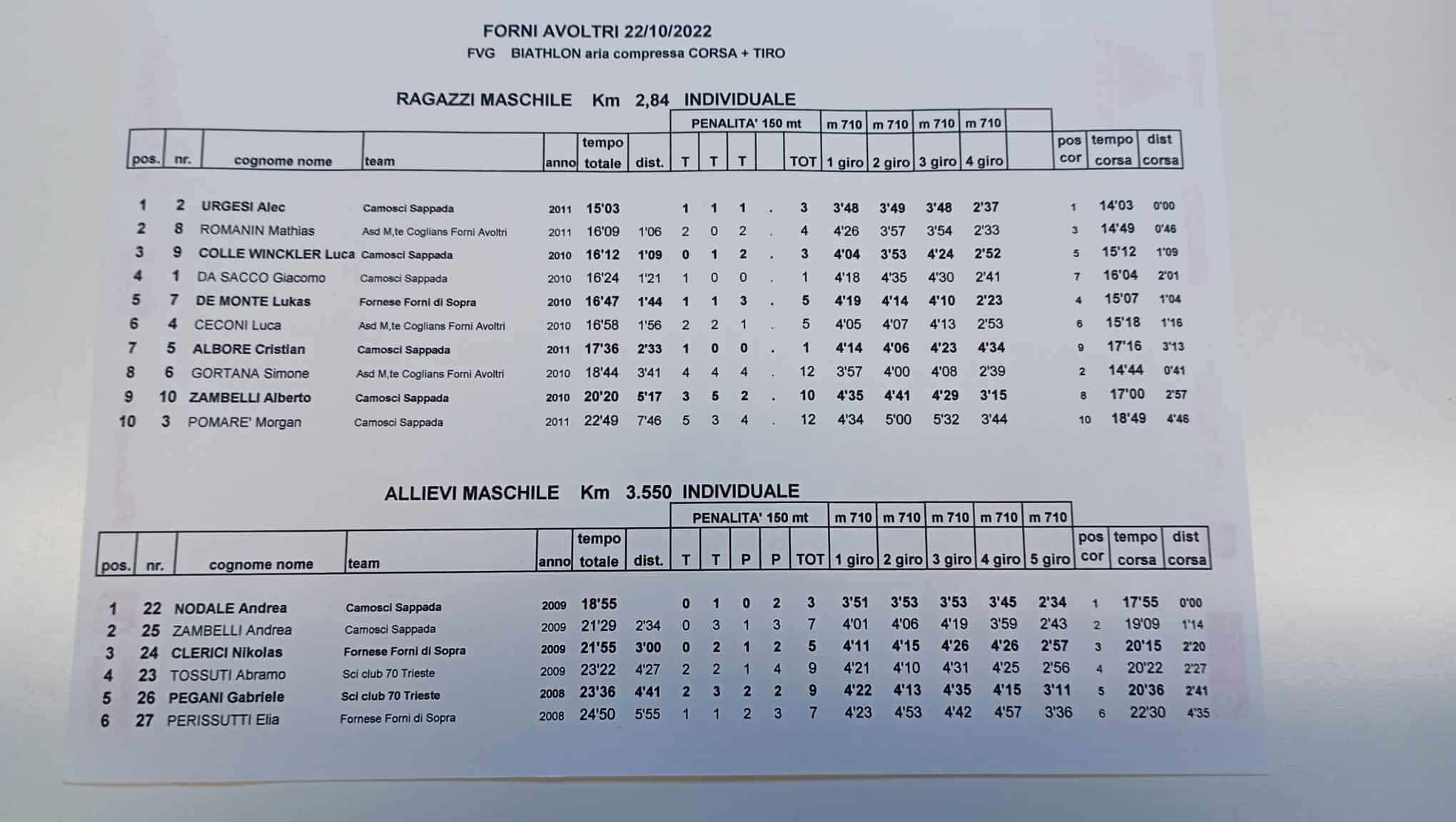 Tra i Ragazzi miglior tempo per Alex Urgesi dei Camosci, con 1’06” su Mathias Romanin della Monte Coglians e 1’09” su Luca Colle Winkler ancora dei Camosci.
