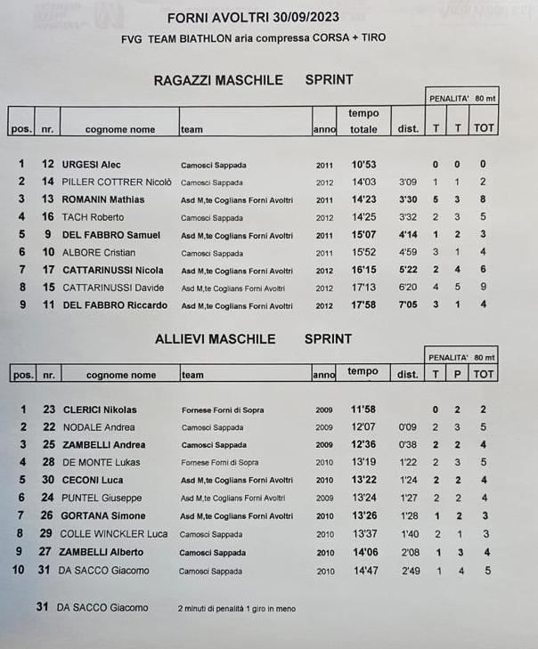 In programma una Sprint, che ha visto nei Ragazzi il netto primo posto di Alec Urgesi dei Camosci, il solo ieri a non commettere errori al tiro. Alle sue spalle il compagno di squadra Nicòlò Piller Cottrer e Mathias Romanin dei Camosci.