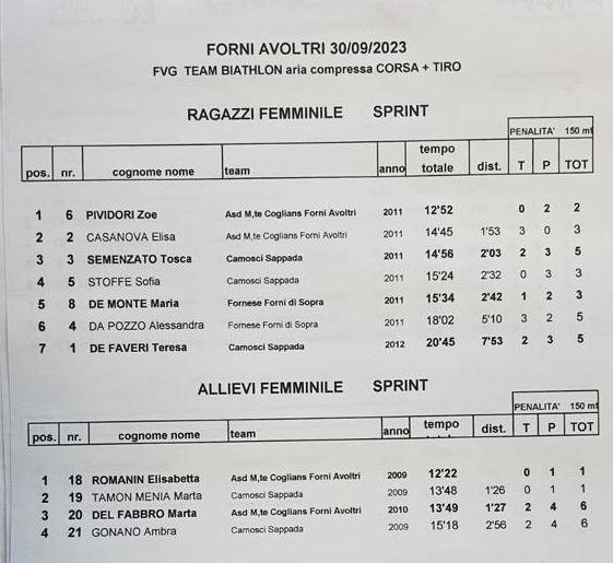 Nelle Ragazze Zoe Pividori della Monte Coglians precede di quasi 2′ la compagna di club Elisa Casanova, con Tosca Semenzato dei Camosci terza.
