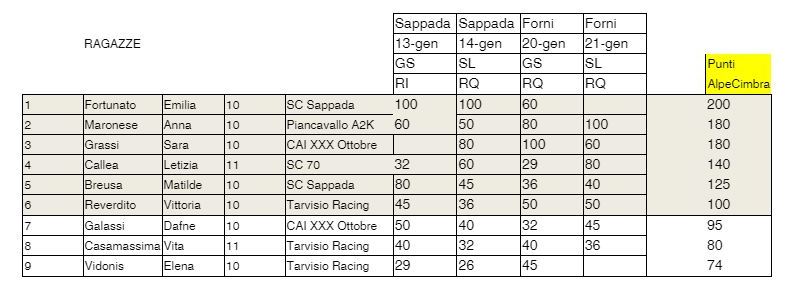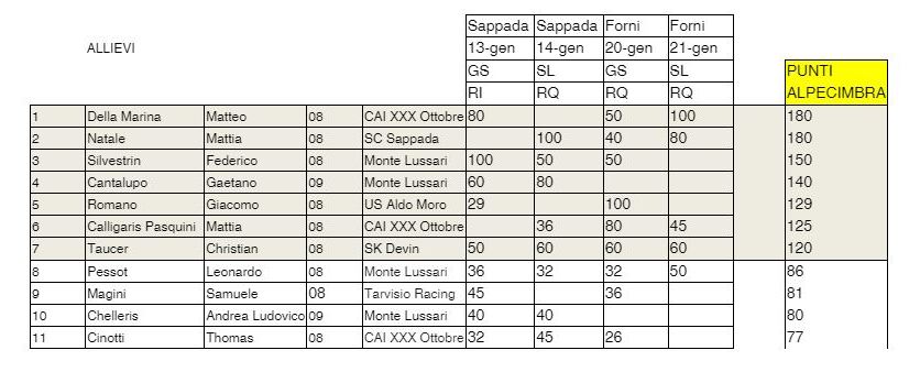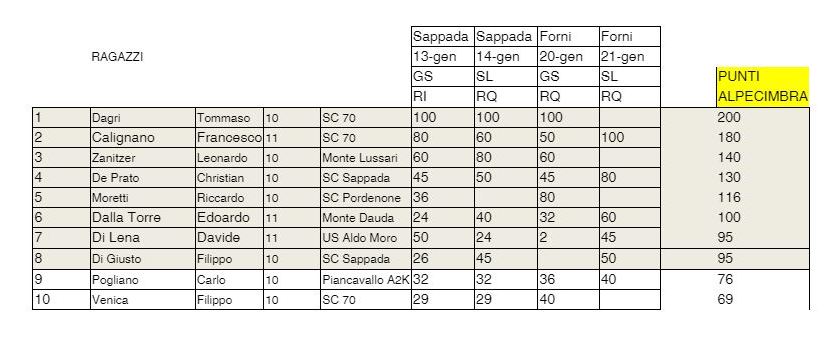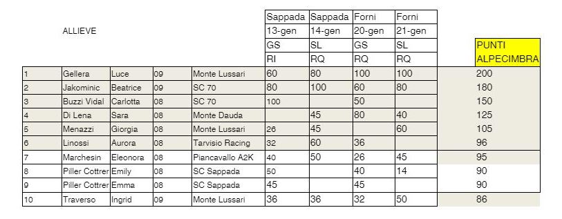 Sotto le classifiche al termine delle prime quattro gare del GP FISI FVG, con evidenziati i nomi dei partecipanti al test.