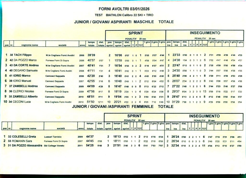 Nella sprint maschile si è imposto Marco Da Pozzo con 7″ su Filippo Tach e 41″ su Marco Iorio. Tach ha tagliato per primo il traguardo dell’inseguimento con 13″ su Andrea Da Corte e 56″ su Samuele Degano.