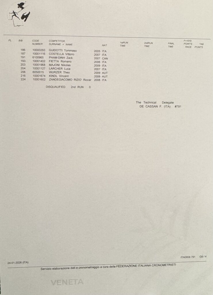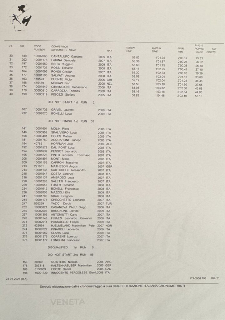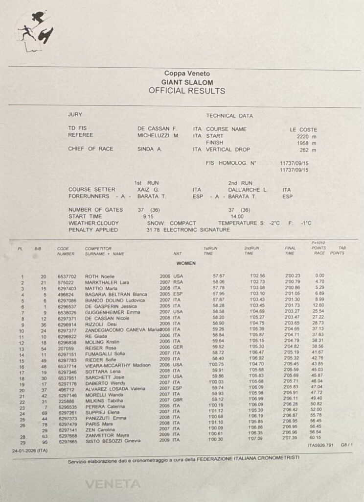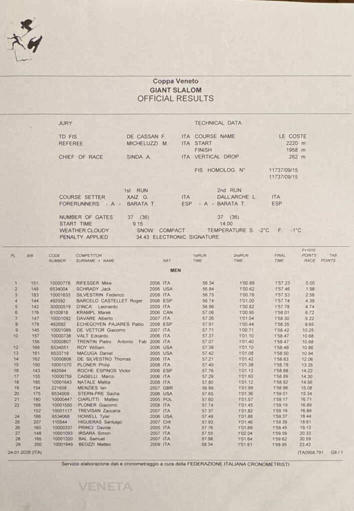 Ieri sulla pista Le Coste del Passo San Pellegrino si è disputato un gigante valido per la Coppa Veneto BCC Veneta, il circuito regionale Fis Njr. A livello assoluto, in campo maschile si è imposto l’altoatesino Mike Rifesser sullo statunitense Jack Schrady e su Federico Silvestrin, dello Sci Cai Monte Lussari. Quinto posto assoluto per Leonardo D’Incà (Sci club Trichiana), vincitore di giornata della Coppa Veneto.