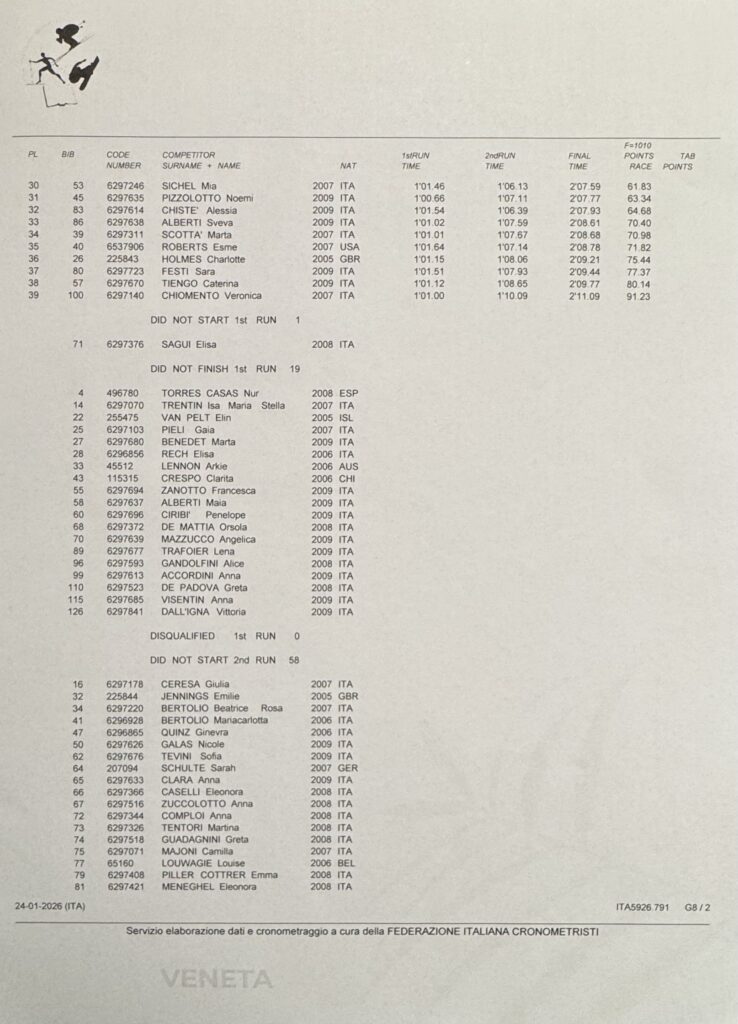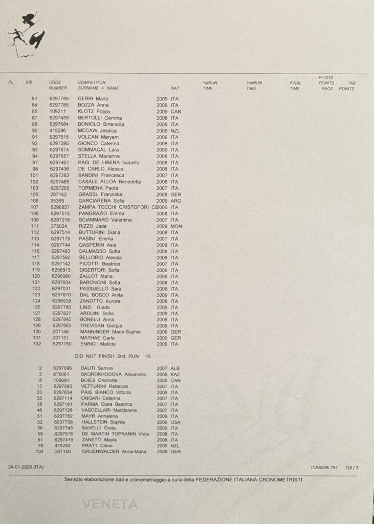 Per quanto riguarda le ragazze, a imporsi nella classifica assoluta è stata la statunitense Noelle Roth davanti a Lara Markthaler (federazione sudafricana) e a Marta Mattio (Sci club Sestriere). Sesta assoluta e prima di Coppa Veneto Jessica De Gasperin, dello Ski College Veneto Falcade.